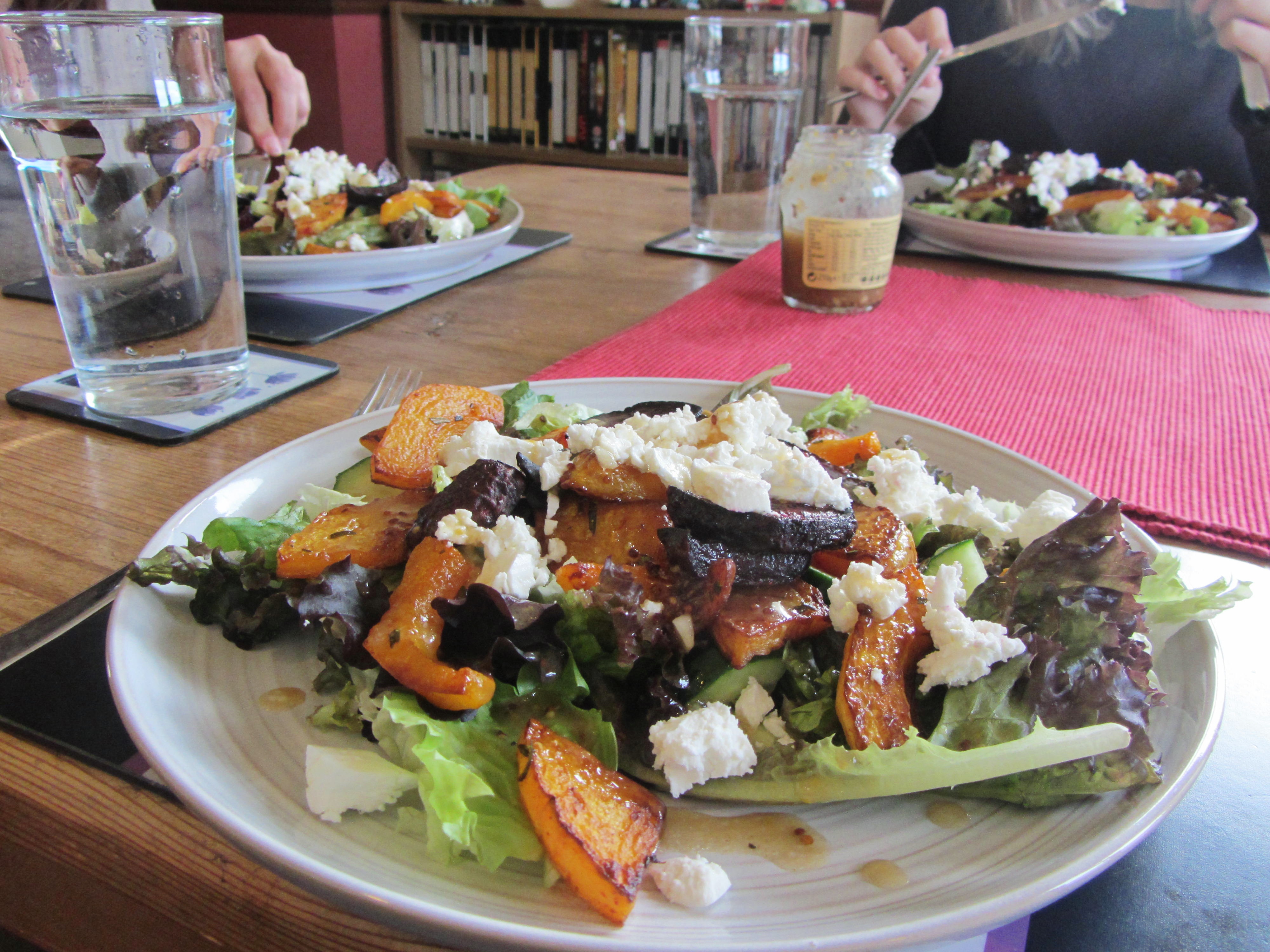 2. Wash the leaves and wash and slice the cucumber – then either mix in the roasted vegetables, or arrange them on top of the leaves. Crumble over the goats’ cheese and drizzle over your dressing, and voila!