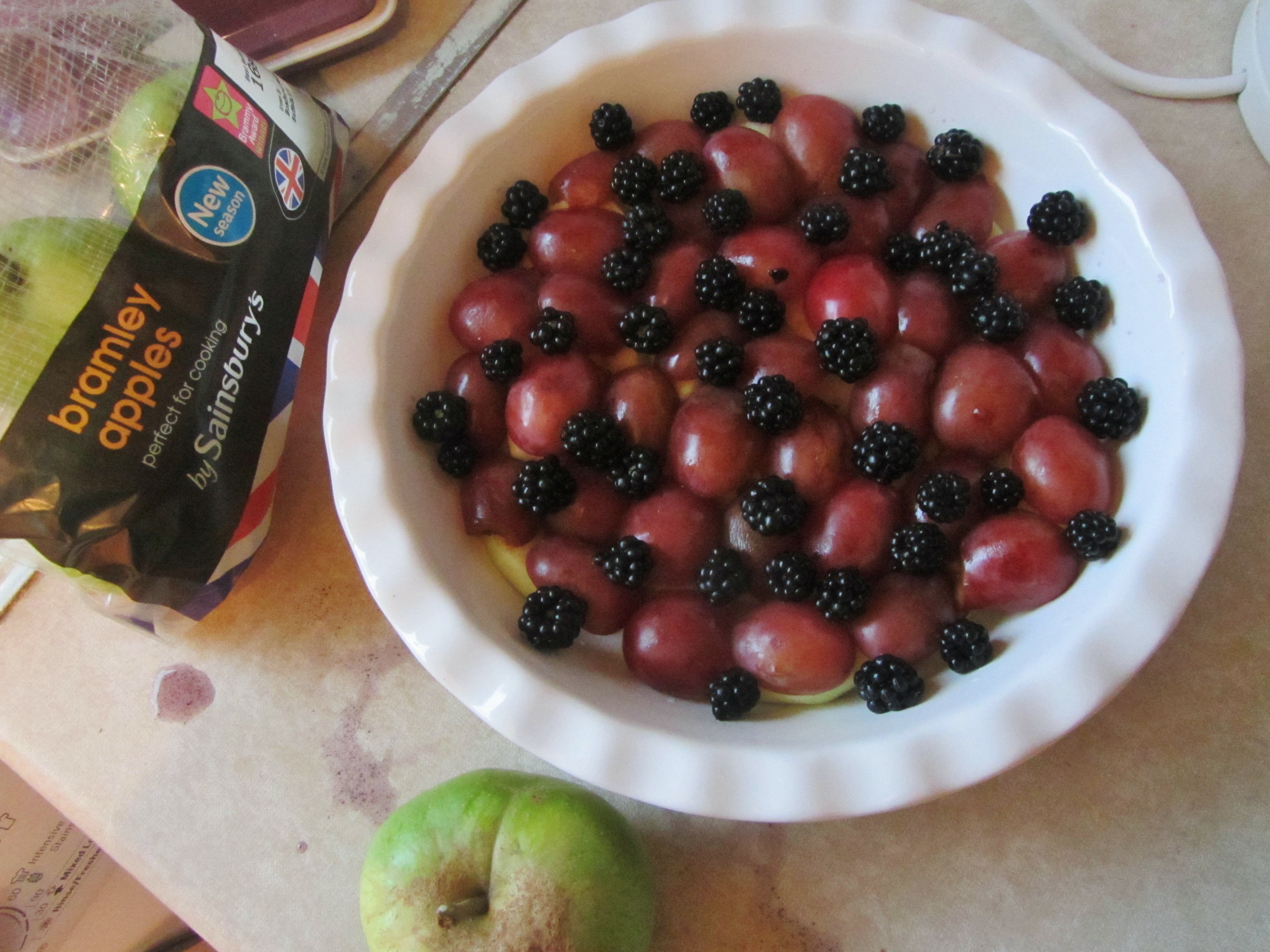 1. Start by preheating the oven to 180°C. Prep the apples and place them into a large, deep dish, then toss them in the lemon juice to stop them discolouring. Layer the plums on top, then scatter over the blackberries.