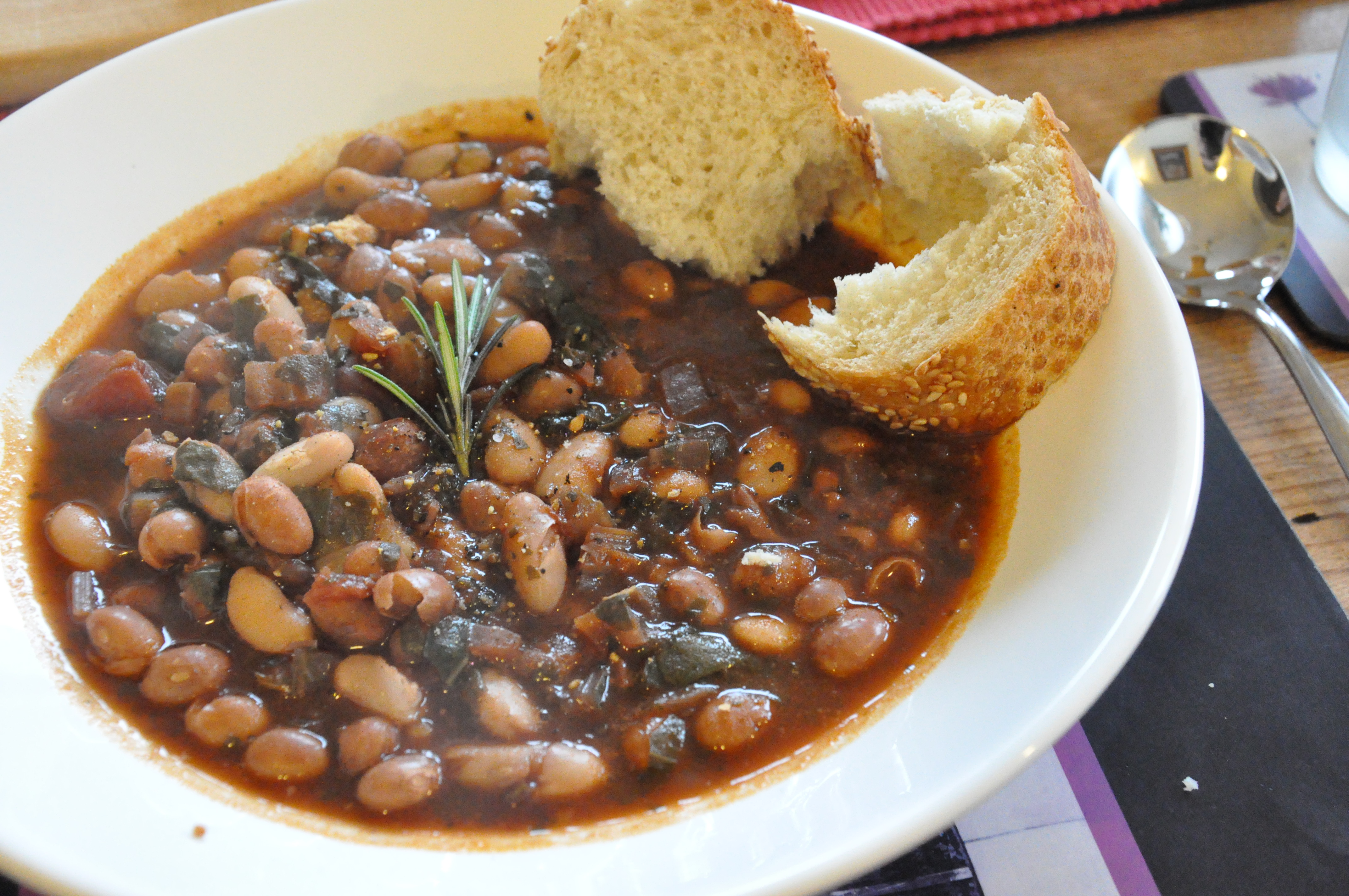 3. Add the beans and spinach, and season. Cook for a further ten minutes (with the lid off), then serve with a few good hunks of bread.