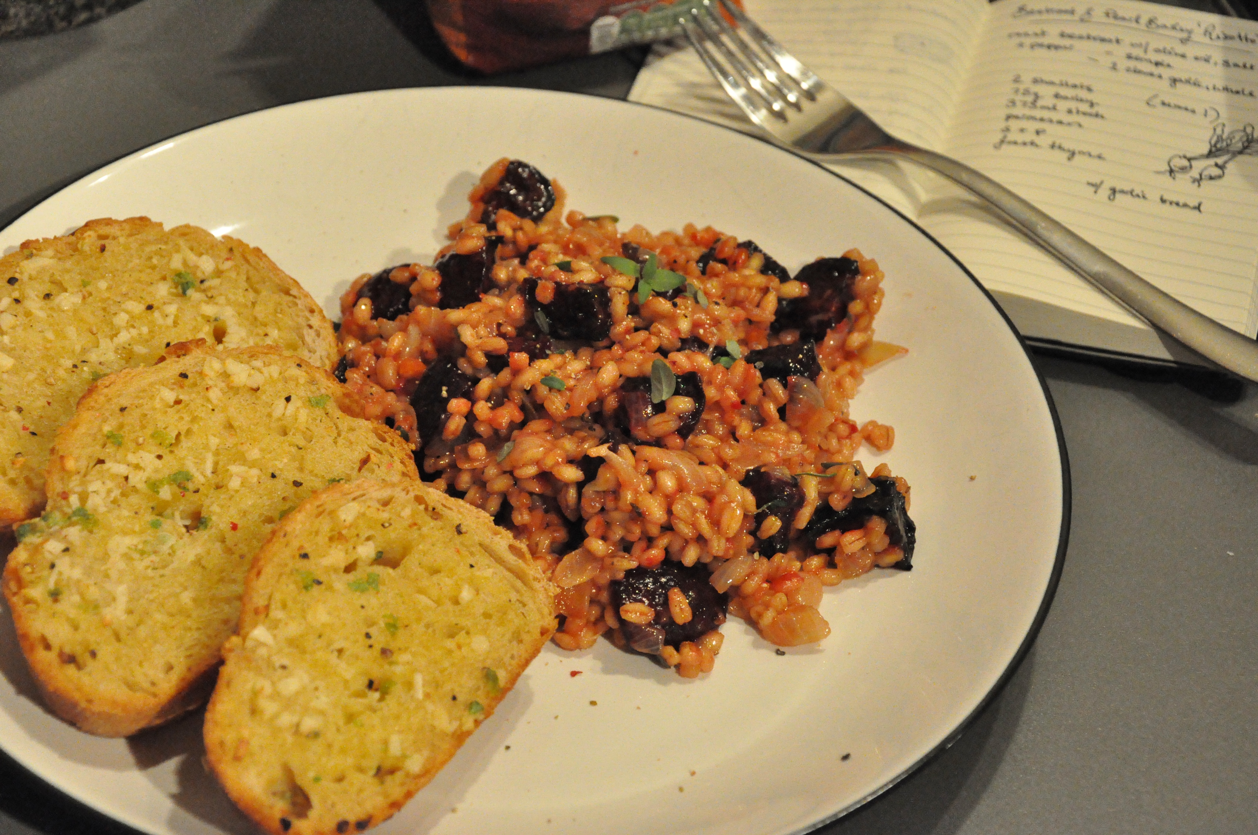 4. Stir in the parmesan, thyme, roasted beetroot and remaining butter. Season to taste and serve with garlic bread.