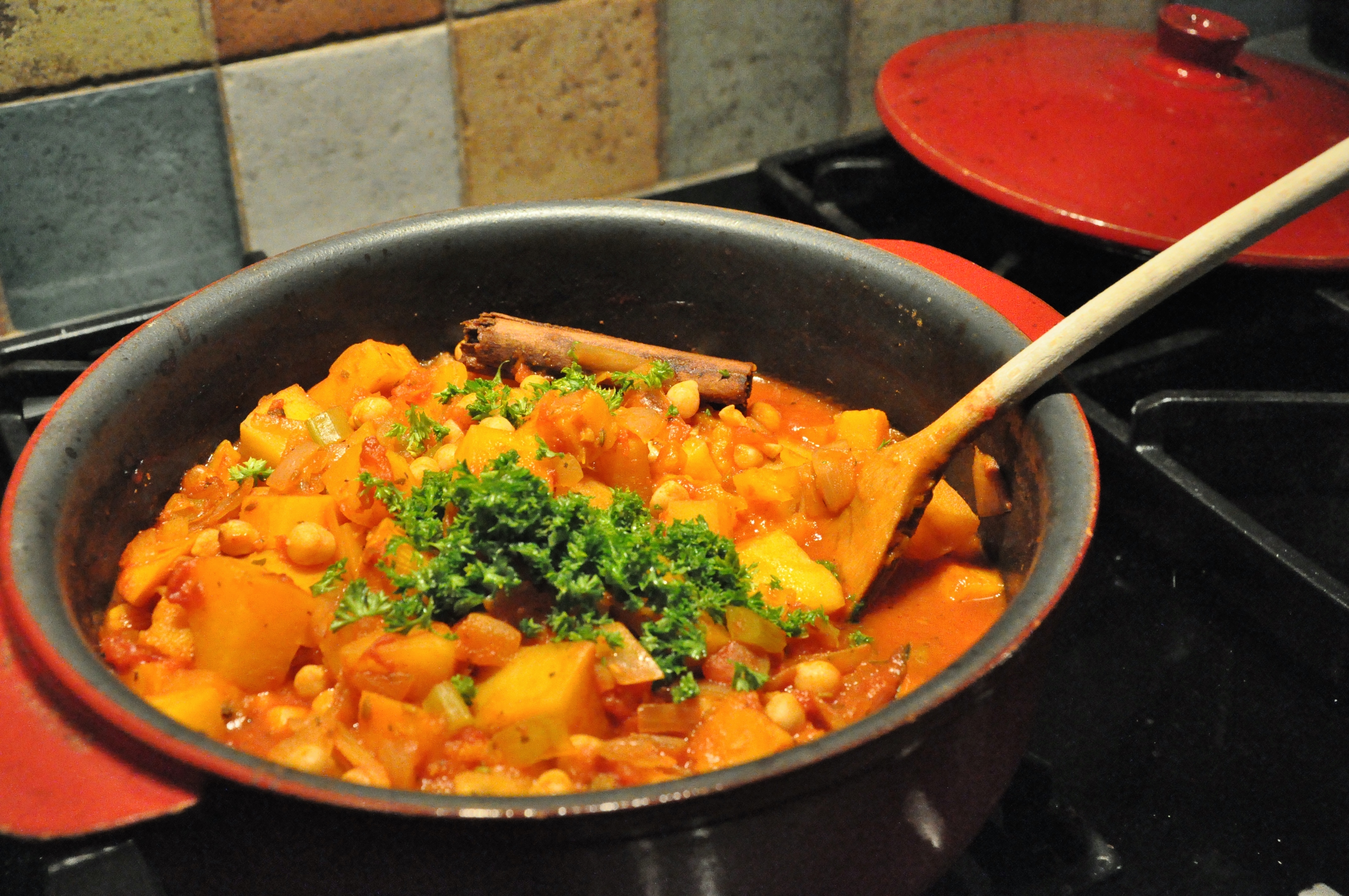 2. Add the squash, sweet potato and swede and cook for a further 10 minutes, until the root vegetables have softened. Stir in the spices before adding the chickpeas, chopped tomatoes and stock, then bring to the boil. Once it’s up to temperature turn down the heat, and allow to simmer and reduce for 15 minutes.