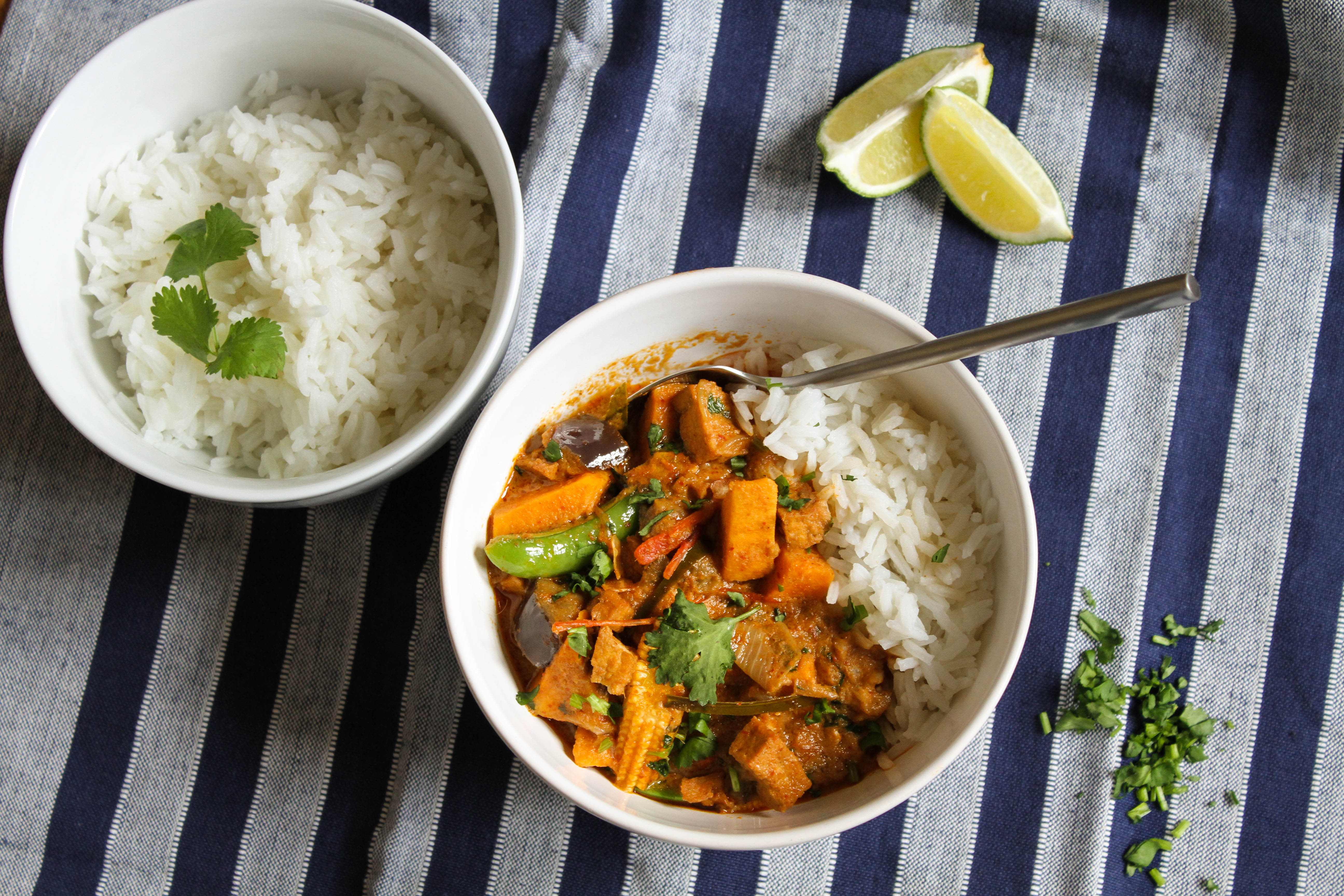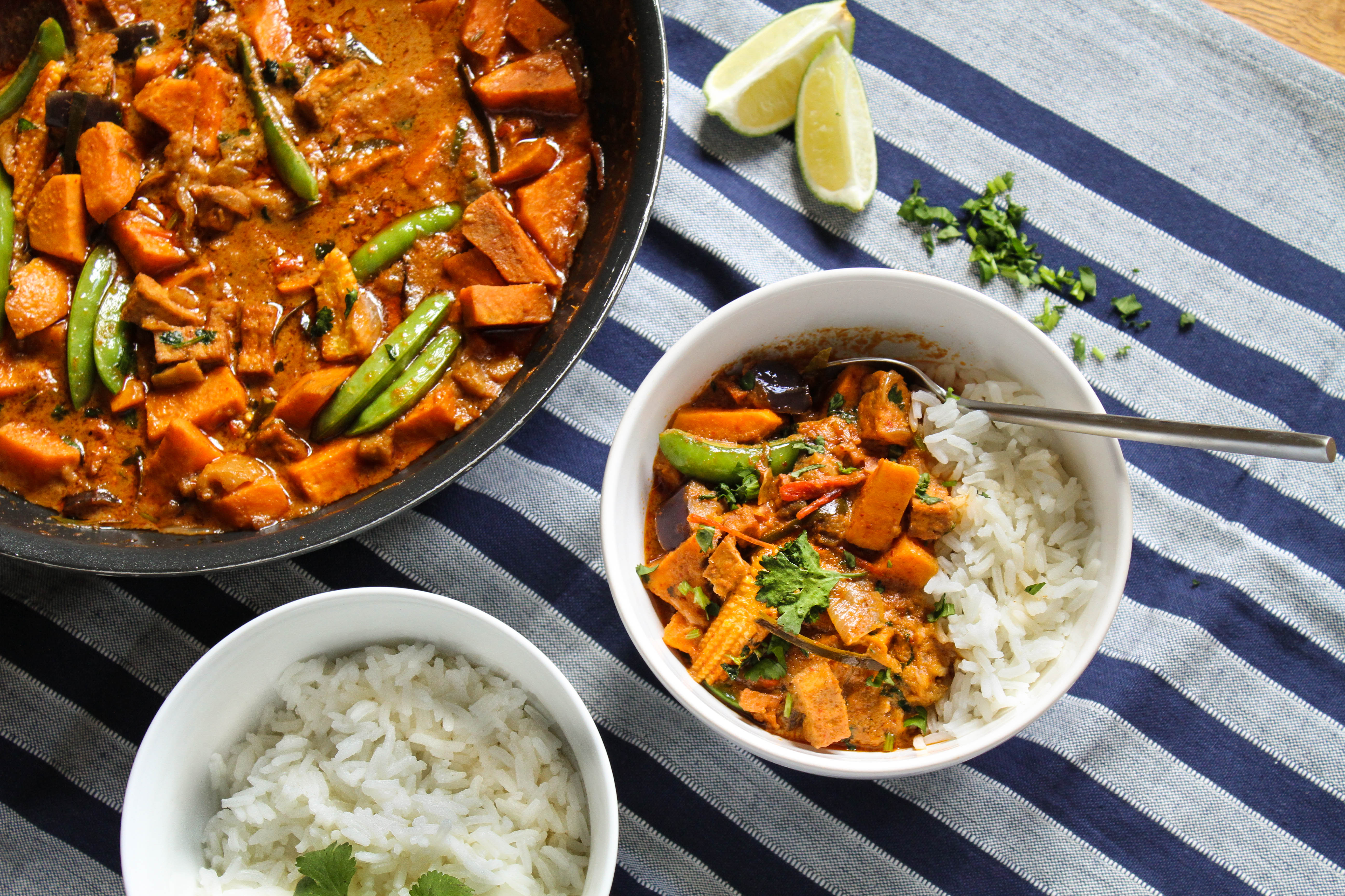 It’s so straightforward to make, and utterly delicious. Even as I write this (pre-publication) I’ve already been asked for the recipe – despite having only finished it this week! You can fiddle around with the vegetables to suit whatever you like or have in the fridge. Just be sure to check your curry paste is veggie (the first one I picked up wasn’t, frustratingly!) – I used Thai Taste, which you can get in most supermarkets or in bulk on Amazon.