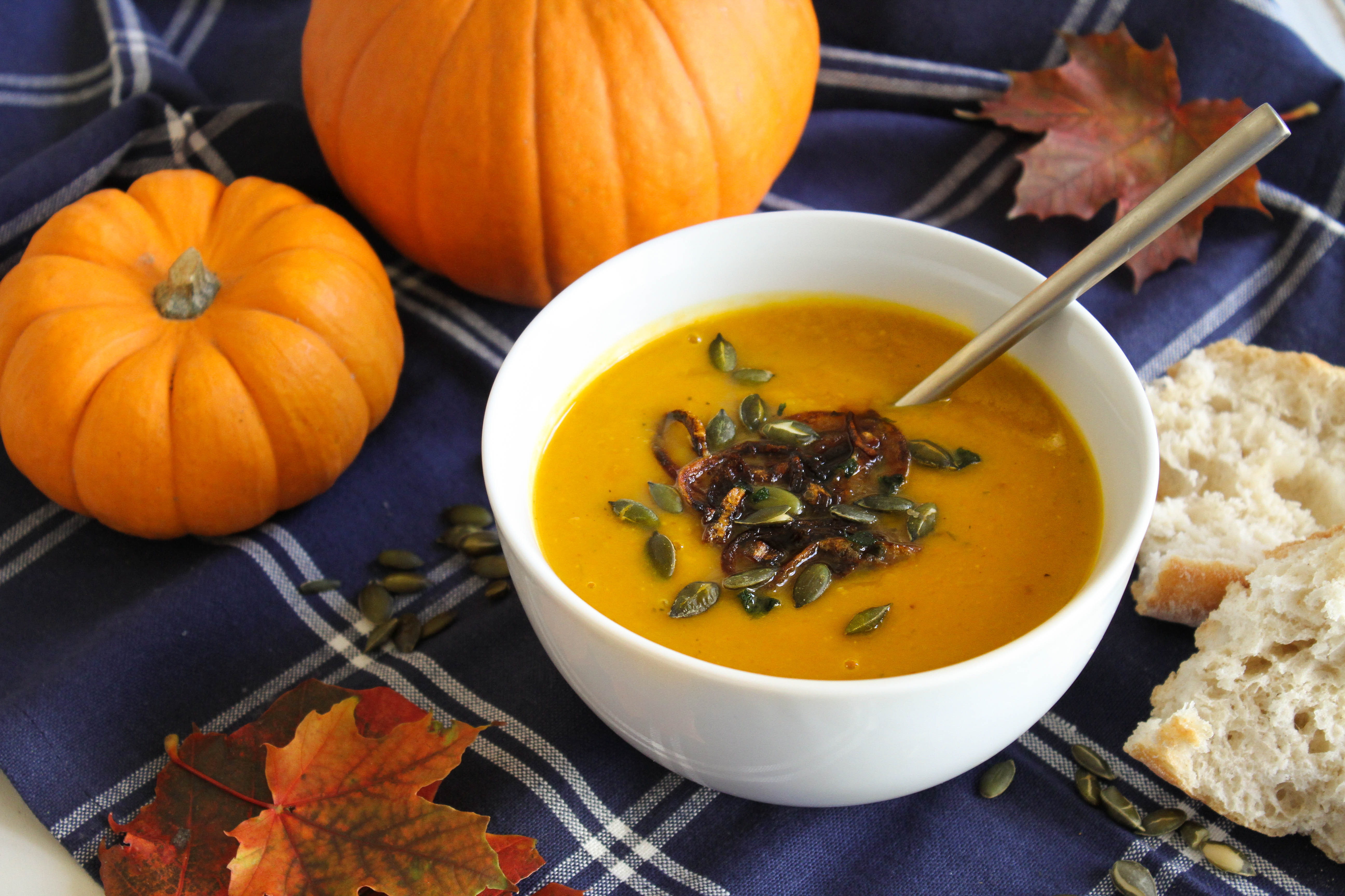 5. Use a stick blender to blend the soup, then ladle into bowls. Sprinkle the toasted pumpkin seeds and shallots over the top, then serve with crusty bread.