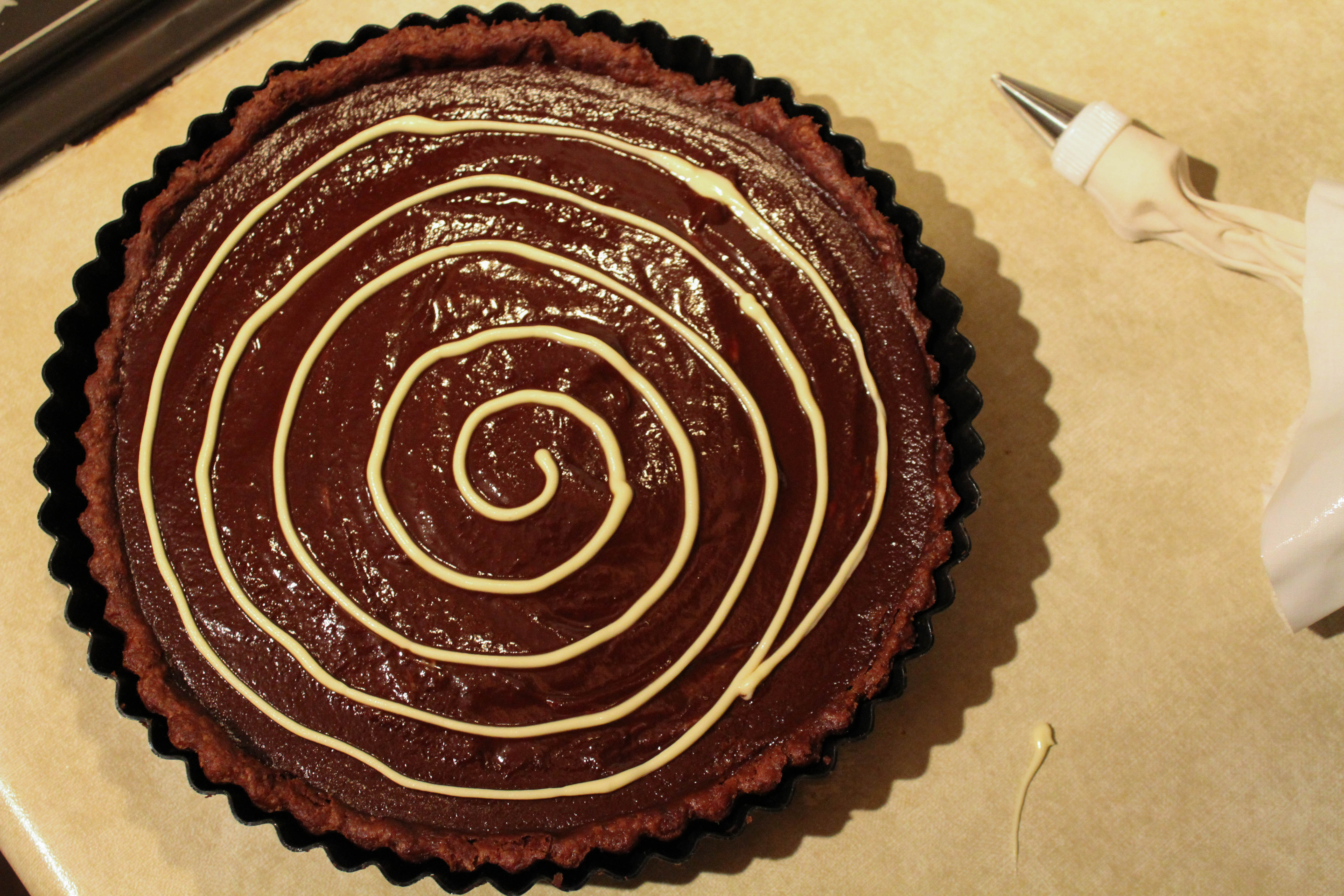4. For the decoration, melt the white chocolate and butter together in the same way as above. Allow to cool slightly – you want it liquid enough to work with but not so hot that it burns your hands – then put into a piping bag with a size 4 nozzle and pipe a swirl onto the tart.