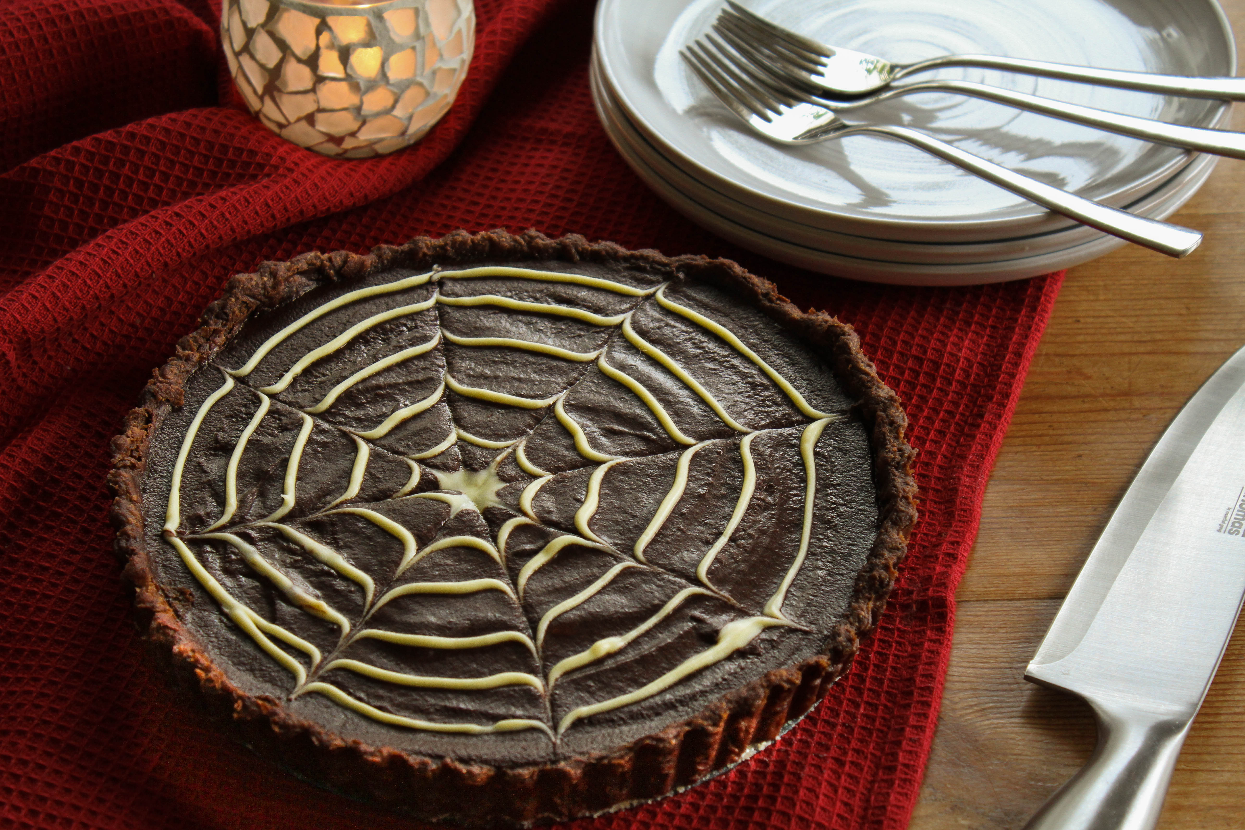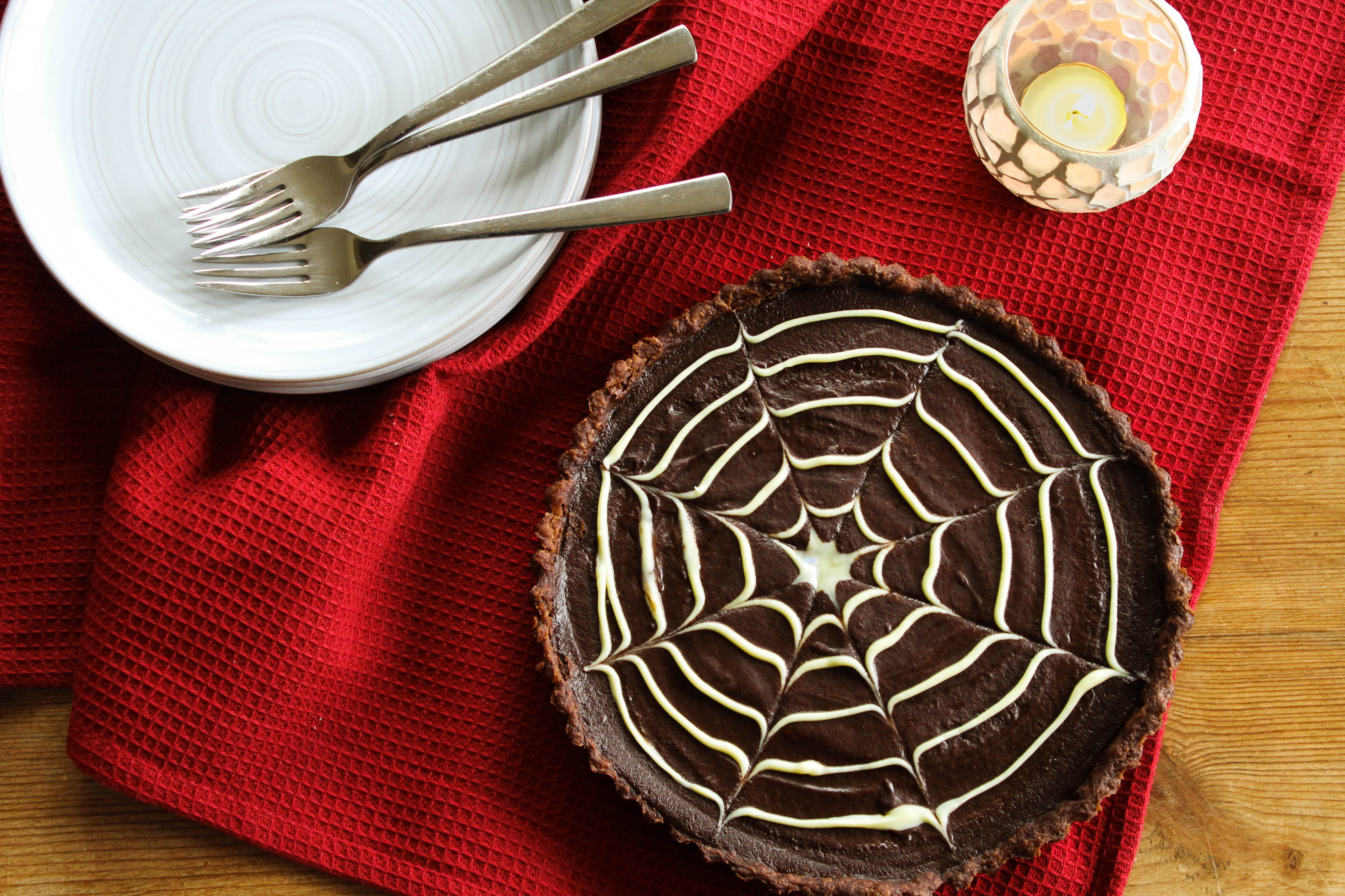 5. Use a cocktail stick to drag a line from the centre of the swirl to the edge of the tart; repeat this 8 more times to create a spider web effect. Allow at least another hour for the tart to cool completely, then serve.