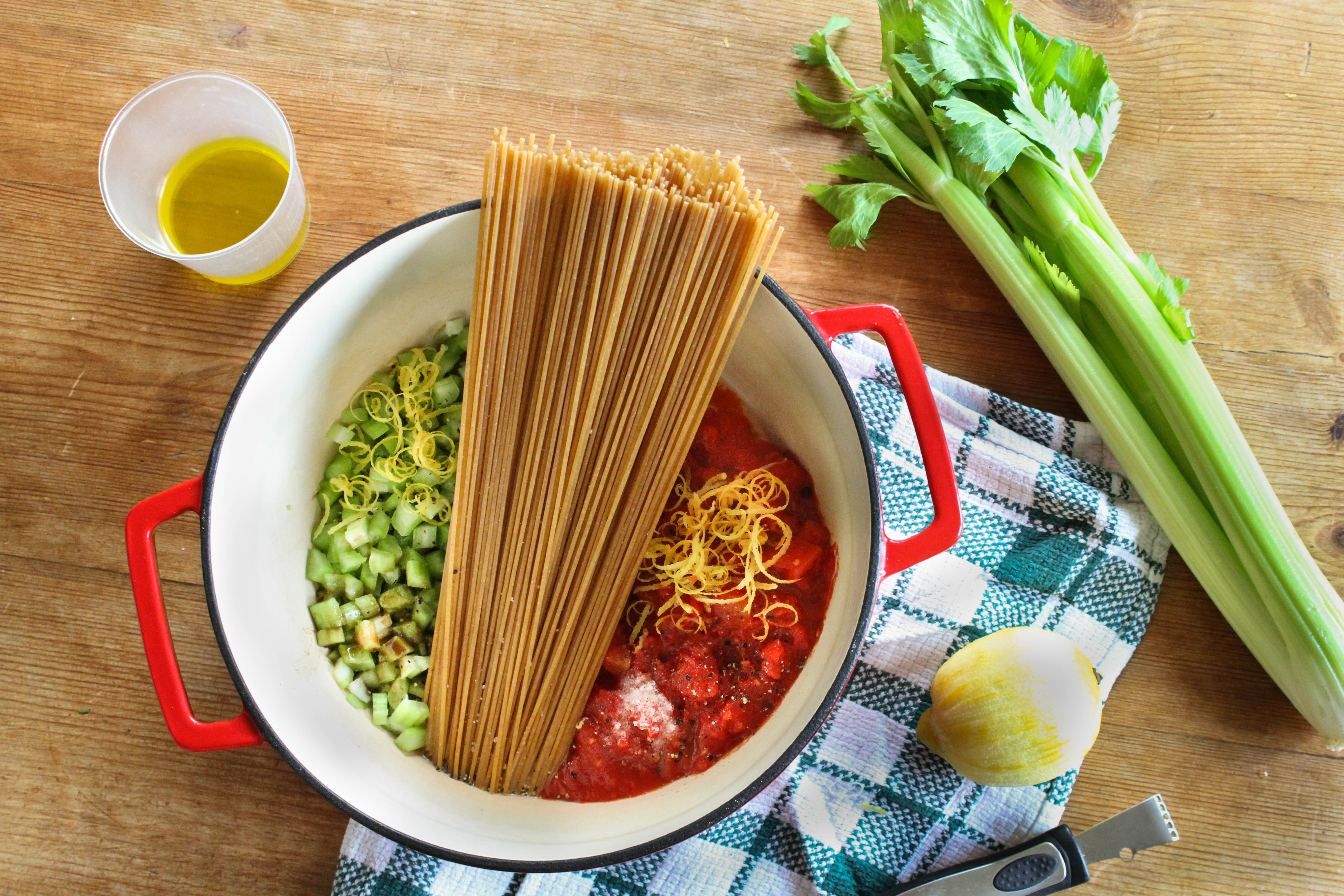 1. Put everything into a pan. Make sure the pasta is completely covered – if you’re using spaghetti you’ll either need a wide pan or to break the pasta up a bit, as it needs to lie flat.