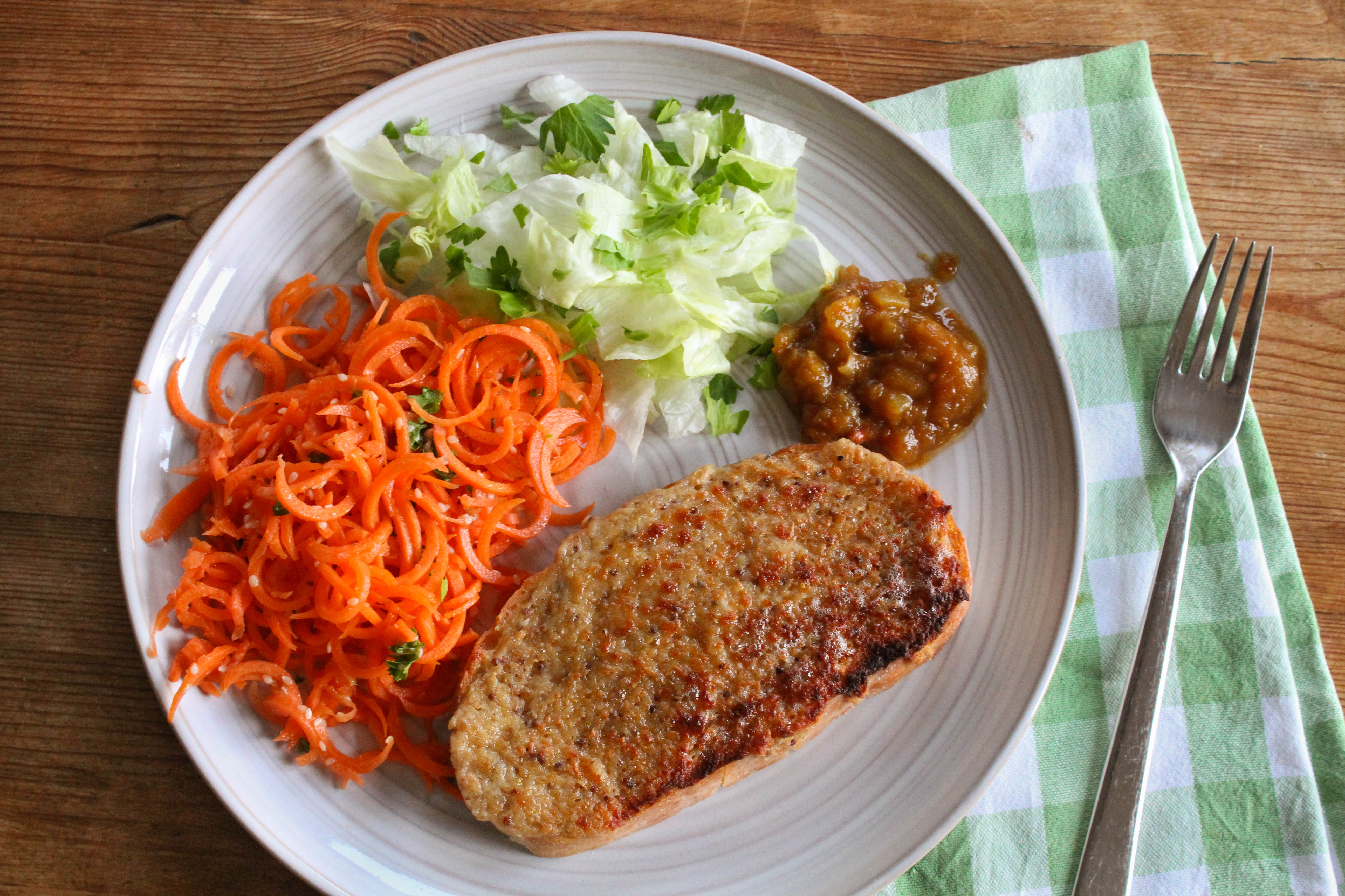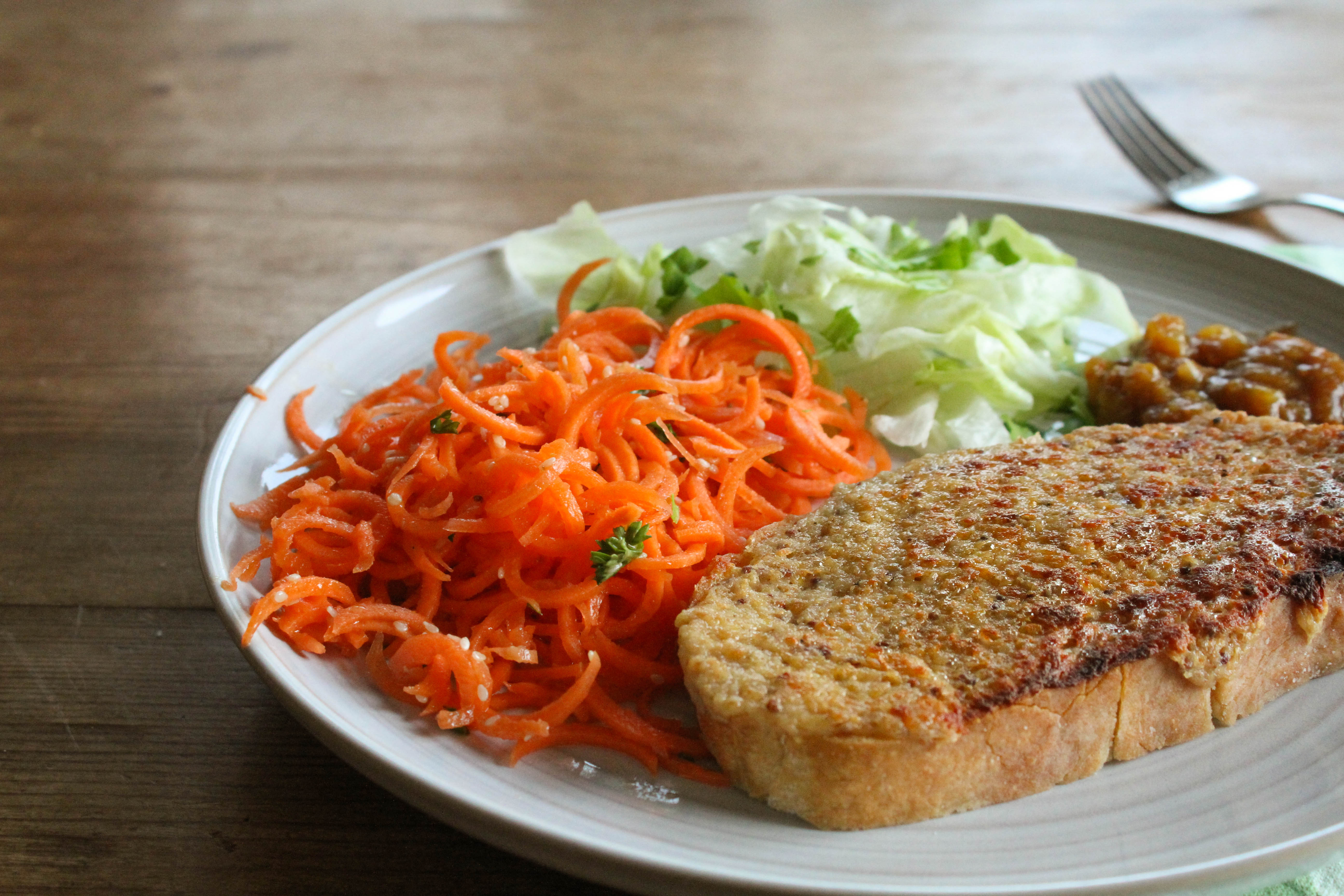 3. To make the sesame carrot salad, begin by coarsely grating your carrot. If you prefer, you can spiralize it – I got a spiralizer for Christmas, and this was its first outing! Shake the rest of the ingredients together in a jar, then drizzle over the carrot. Serve with the rarebit, a handful of leaves and a dollop of chutney.