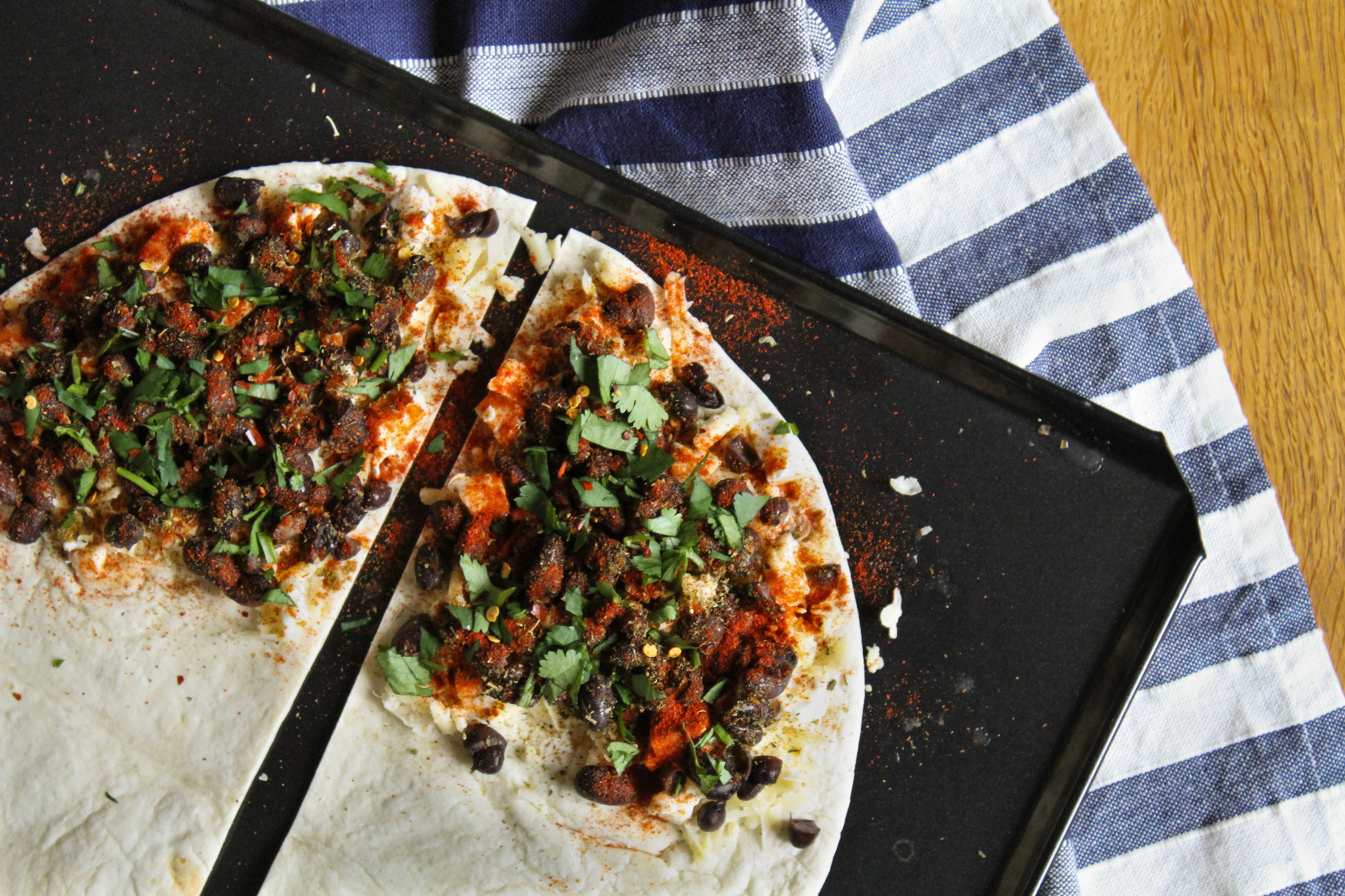 1. Begin by cutting your tortilla in half to create two semi-circles. Over one half of each semi-circle, sprinkle the mozzarella and cheddar, followed by the black beans, herbs and spices. Fold the tortillas in half to cover the filling, and gently press down.