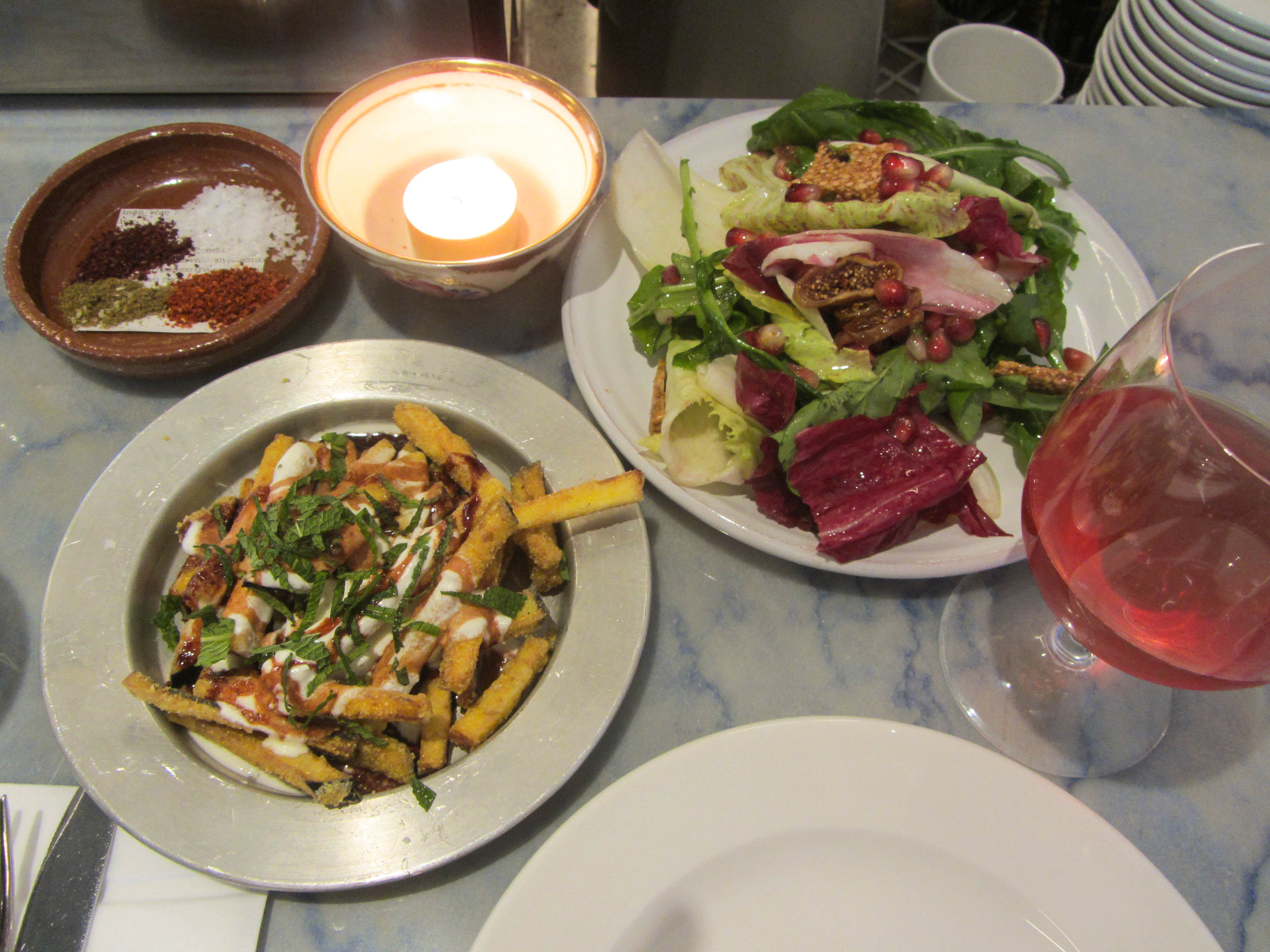 The first of our dishes to arrive was ‘fried aubergine, date molasses, feta’ (£7): a heap of crisp, light aubergine strips topped with whipped, creamy feta, sticky date molasses and shredded mint leaves. This is my favourite dish from Exmouth Market, so I was very pleased to find it on the menu here, and although the recipe has been tweaked it did not disappoint. From here on in we ventured into the unknown, though: next to arrive was ‘green leaves, sesame brittle and dried figs’ (£4.50). This was, as expected, a mound of leaves (though if I’m being picky, not all of them were green!) dotted with sliced dried figs and shards of sesame brittle, drizzled with a fresh, sharp dressing. I loved the figs, and would honestly have liked more of them. The sesame brittle was a nice idea, but to my mind it was too much: the shards were large and few, and dominated any mouthfuls they were part of.