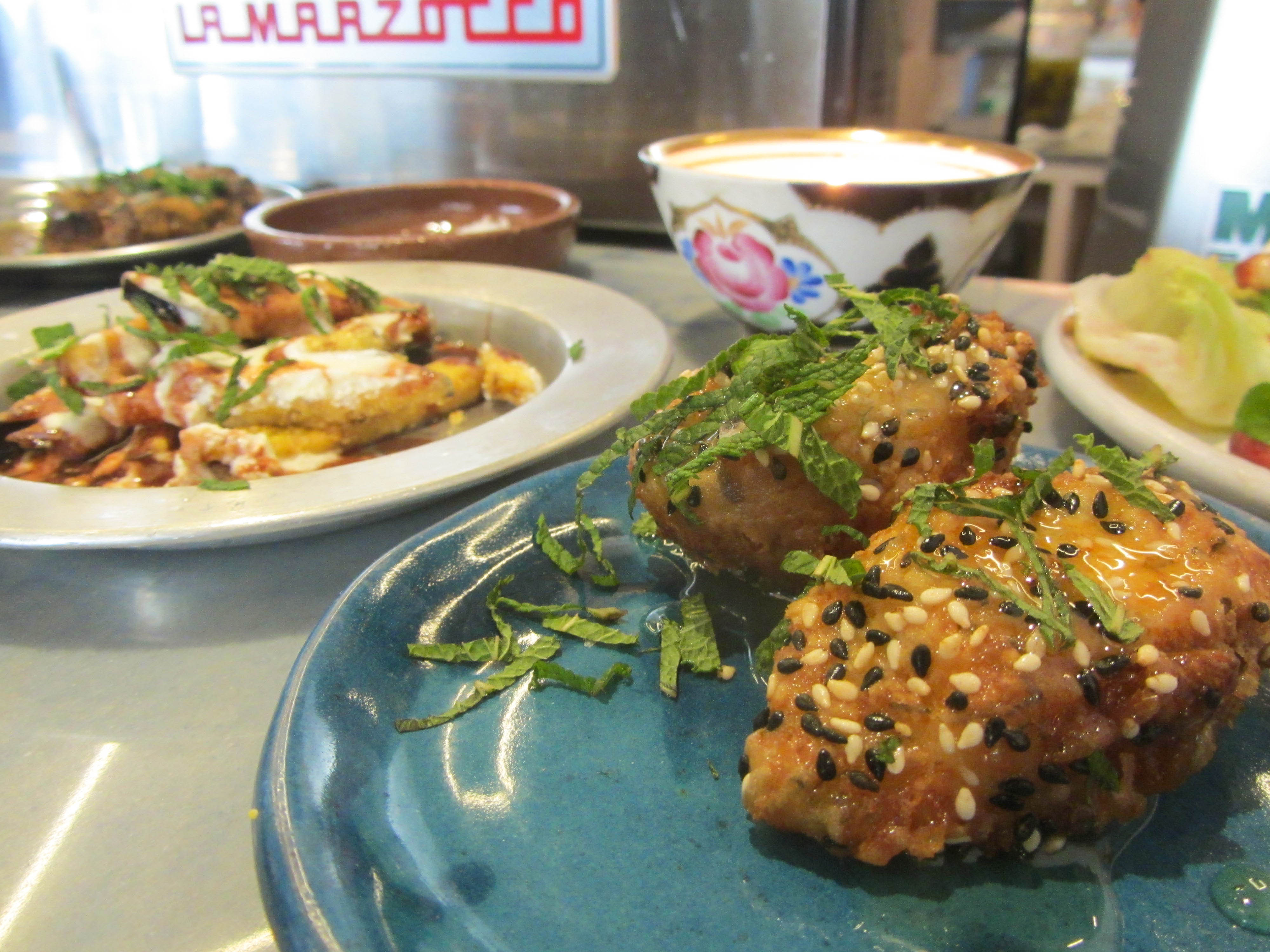 Next to arrive were Josh’s meat dishes – ‘fried rabbit, rosemary, muscatel vinegar’ (£7.50), along with ‘charcoal grilled lamb chops, paprika and anchovy butter’ (£4.50 per chop). It was his first foray into eating rabbit, and he was impressed; the lamb chops went down well, too. Last (but certainly not least) to arrive was the ‘cheese fritters, Cretan thyme honey’ (£6), which divided me and Josh (perhaps even more than the meat!). He wasn’t keen, but I loved them – delicate, deep-fried, slightly tangy cheese covered in nutty black and white sesame seeds and drizzled with slightly savoury honey. They certainly hit the spot, and went well with my salad, too.