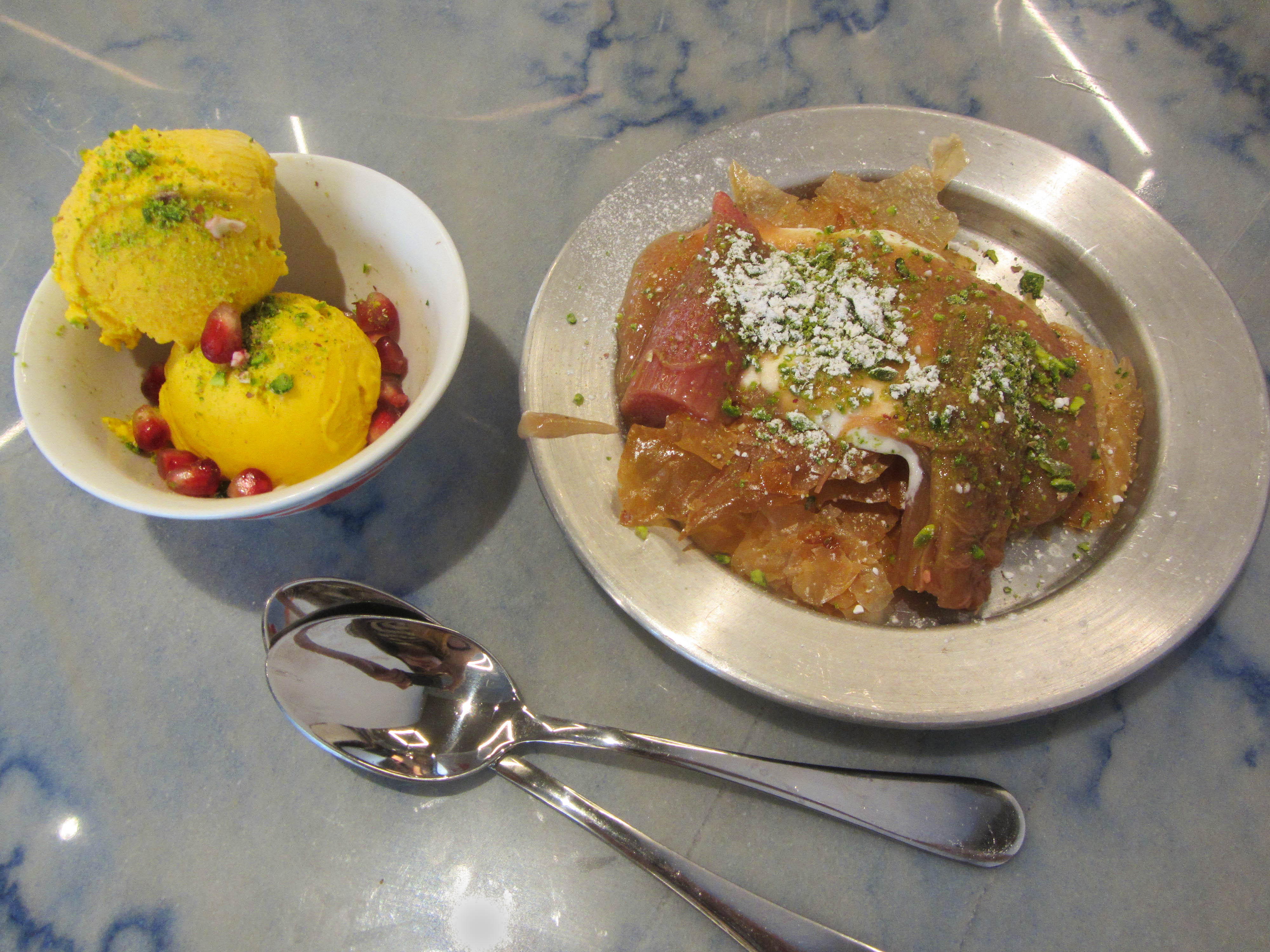 Dessert was as exciting as the mains: I had ‘filo, gum mastic labneh, rhubarb’ (£7), which I’d imagined to be slightly baklava-esque, but it was much more deconstructed, and much less sweet. To start with I was a little unsure – I don’t usually have a very sweet tooth, but felt it would really benefit from a drizzle of honey. The more I ate though, the more I appreciated the occasional, subtle sweetness of the rhubarb, and I happily cleared my plate! Josh was initially disappointed by the lack of chocolate mousse (we both had that the last time we were at Exmouth Market), but happily demolished ‘mango and yoghurt ice cream’ (£6), which was beautifully vivid – both in flavour and appearance – with bright sprinkles of pomegranate seeds and ground pistachio.