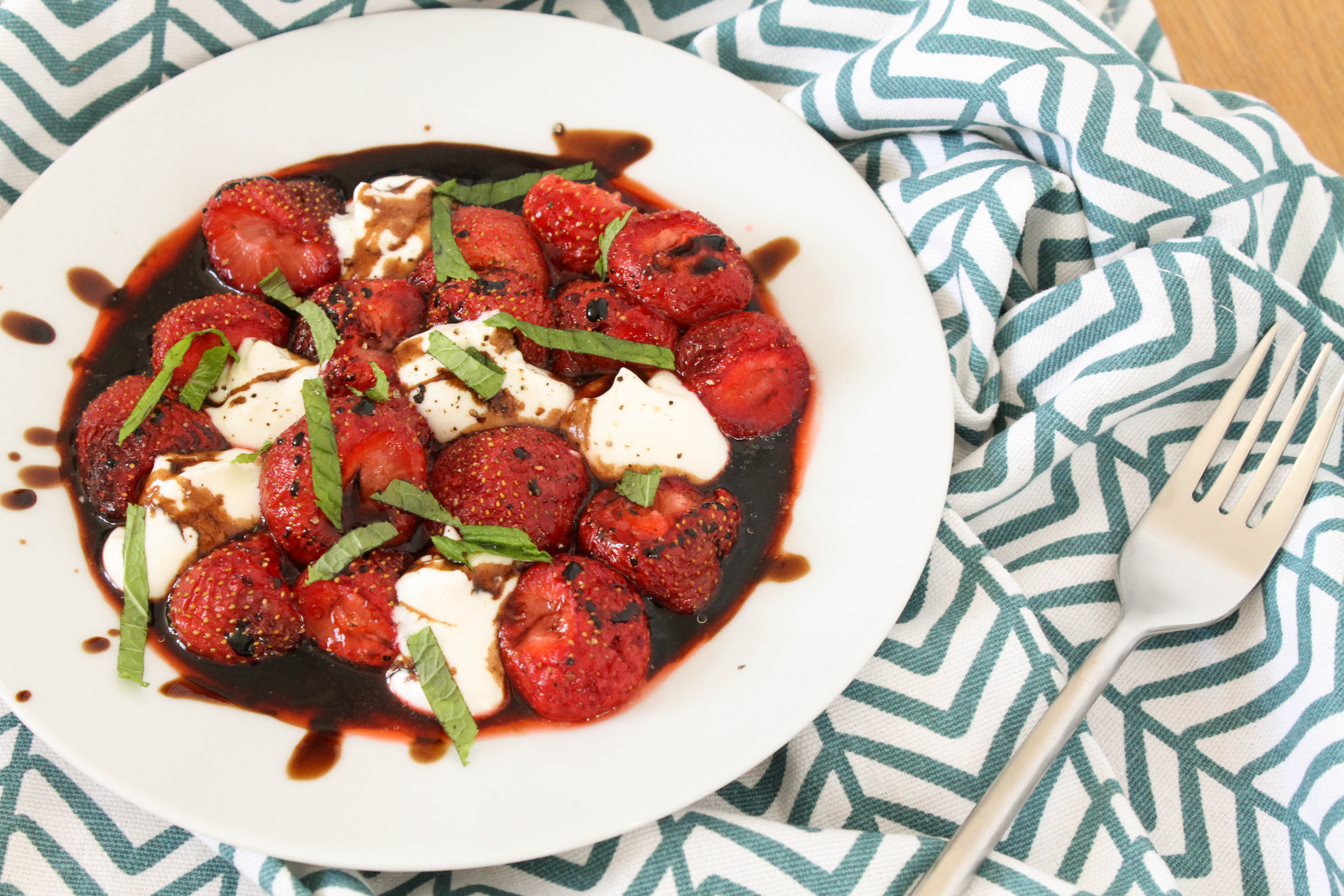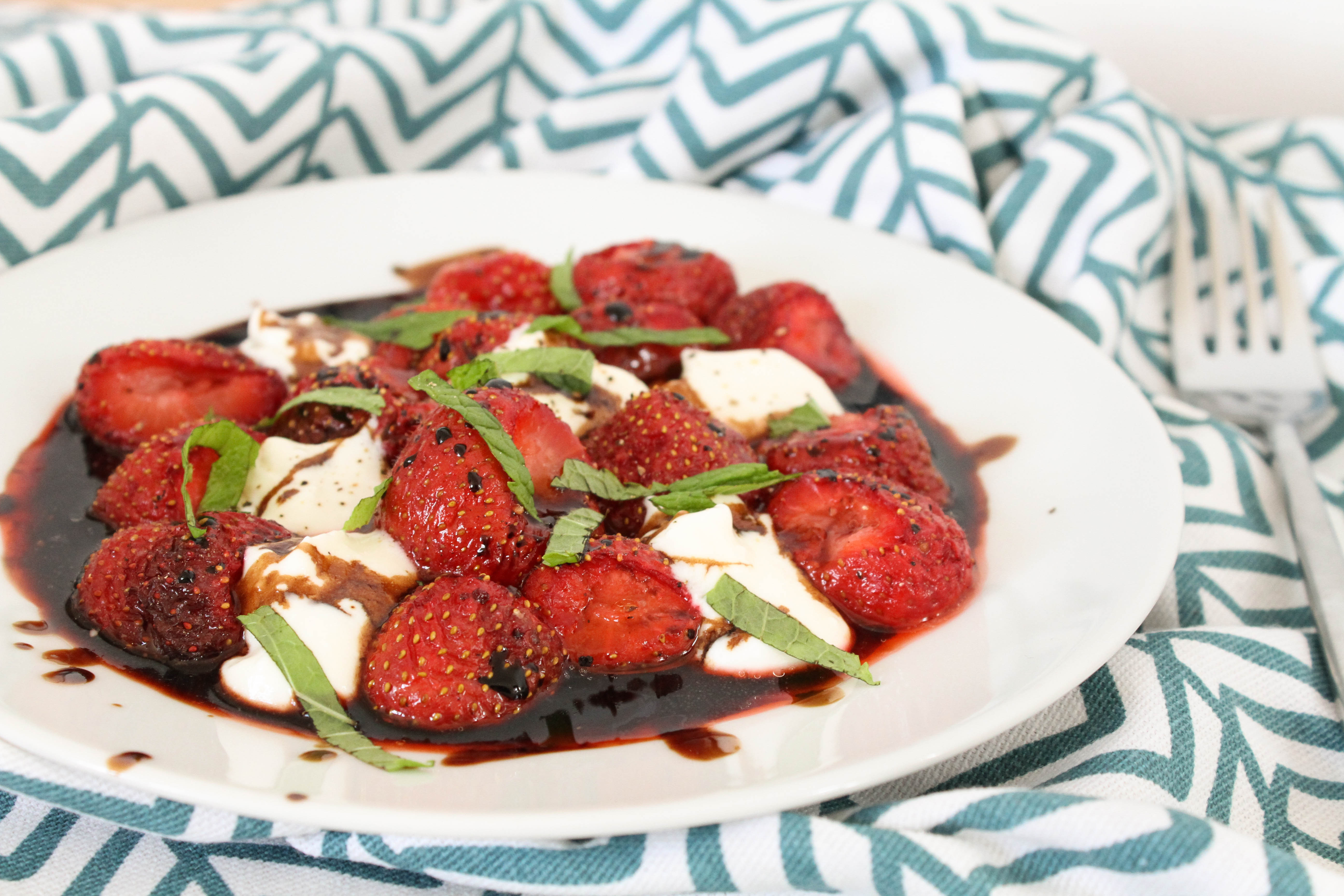 1. Begin by preheating your oven to 200°C. Wash and hull the strawberries, then place on a rimmed baking tray with a few dots of coconut oil. Roast for 15-20 minutes, until the strawberries are beginning to darken and the juices are thickening.