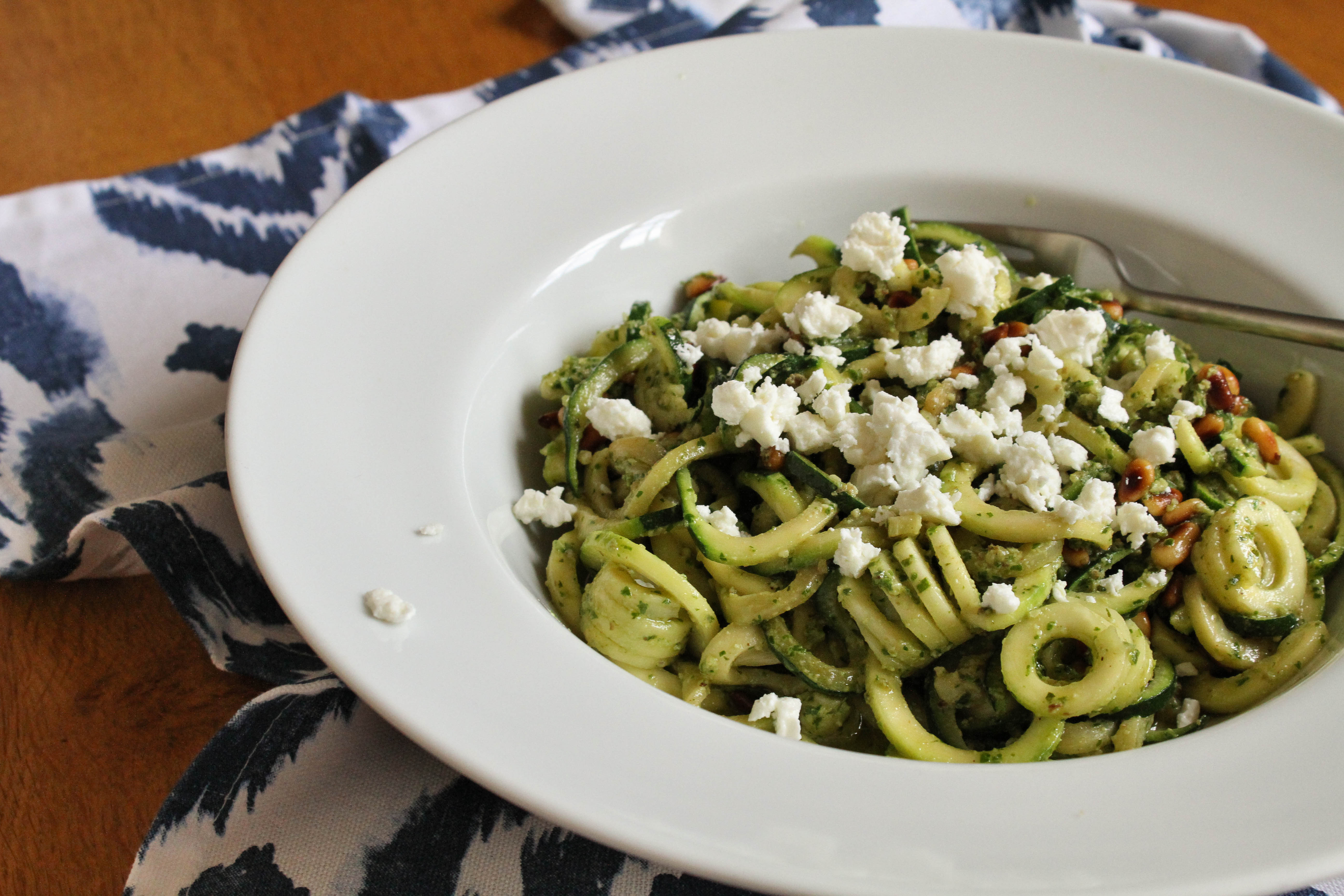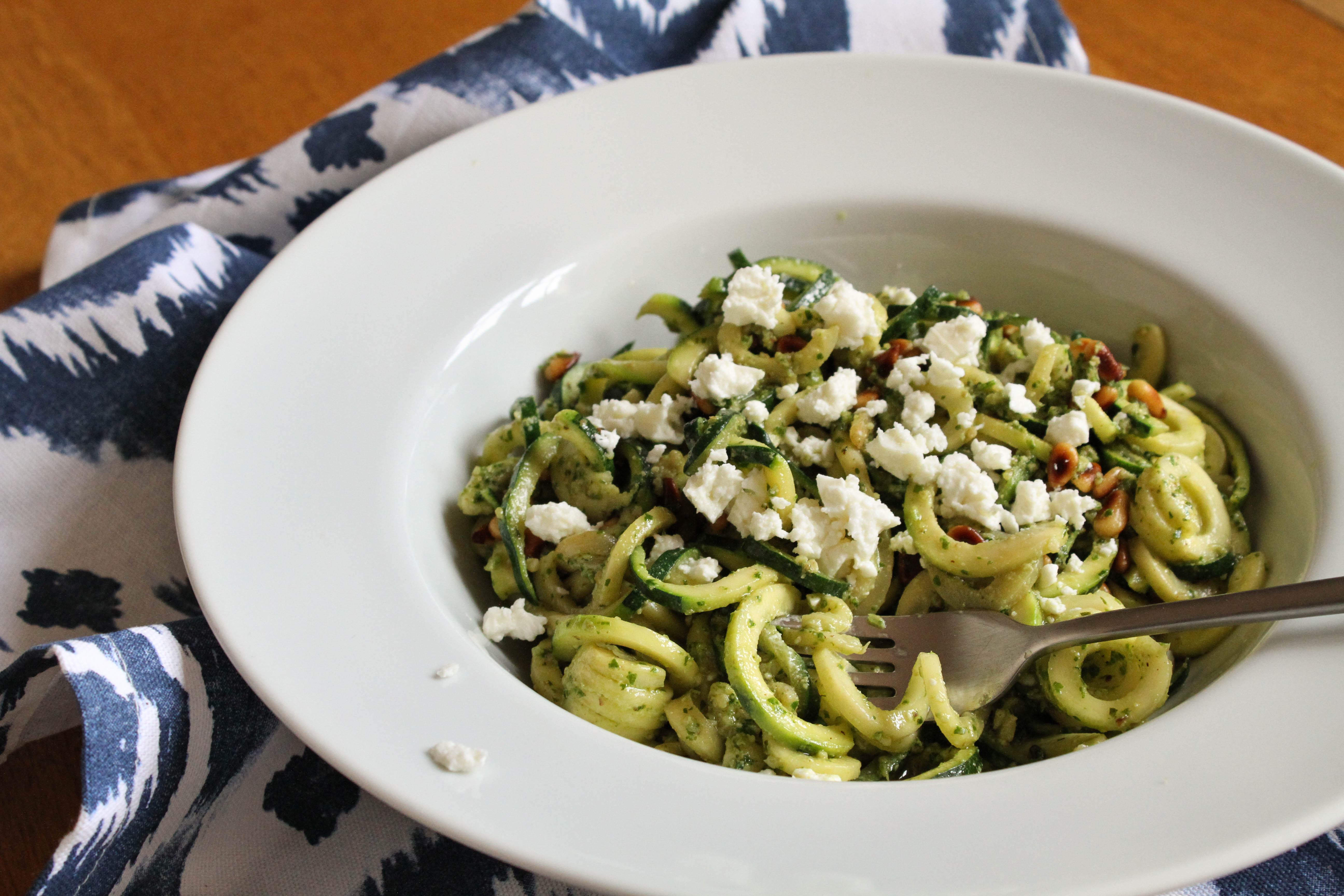 5. Stir the pine nuts and about 3 tbsp of pesto (to taste) through the courgetti, then serve topped with the crumbled feta. Transfer the leftover pesto to a sterilised jar: it should keep in the fridge for up to a month.