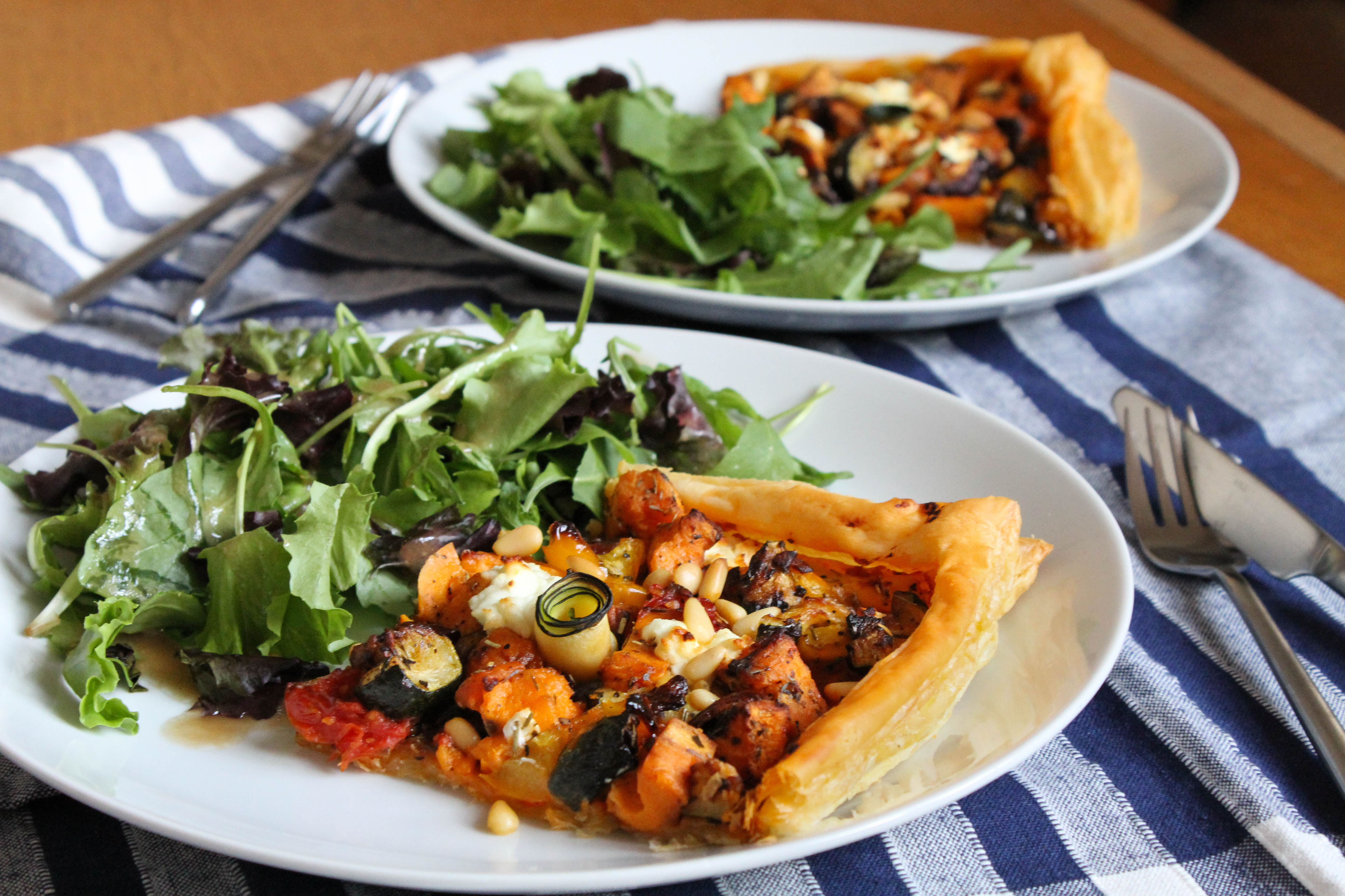 The addition of pine nuts lend a delicate, nutty crunch, while the goats’ cheese cuts through the sweetness of the roasted vegetables. I love the courgette spirals, too – they give the tart a more interesting appearance, and add another texture variant. They’re so quick to do, too, so don’t be tempted to miss them out.