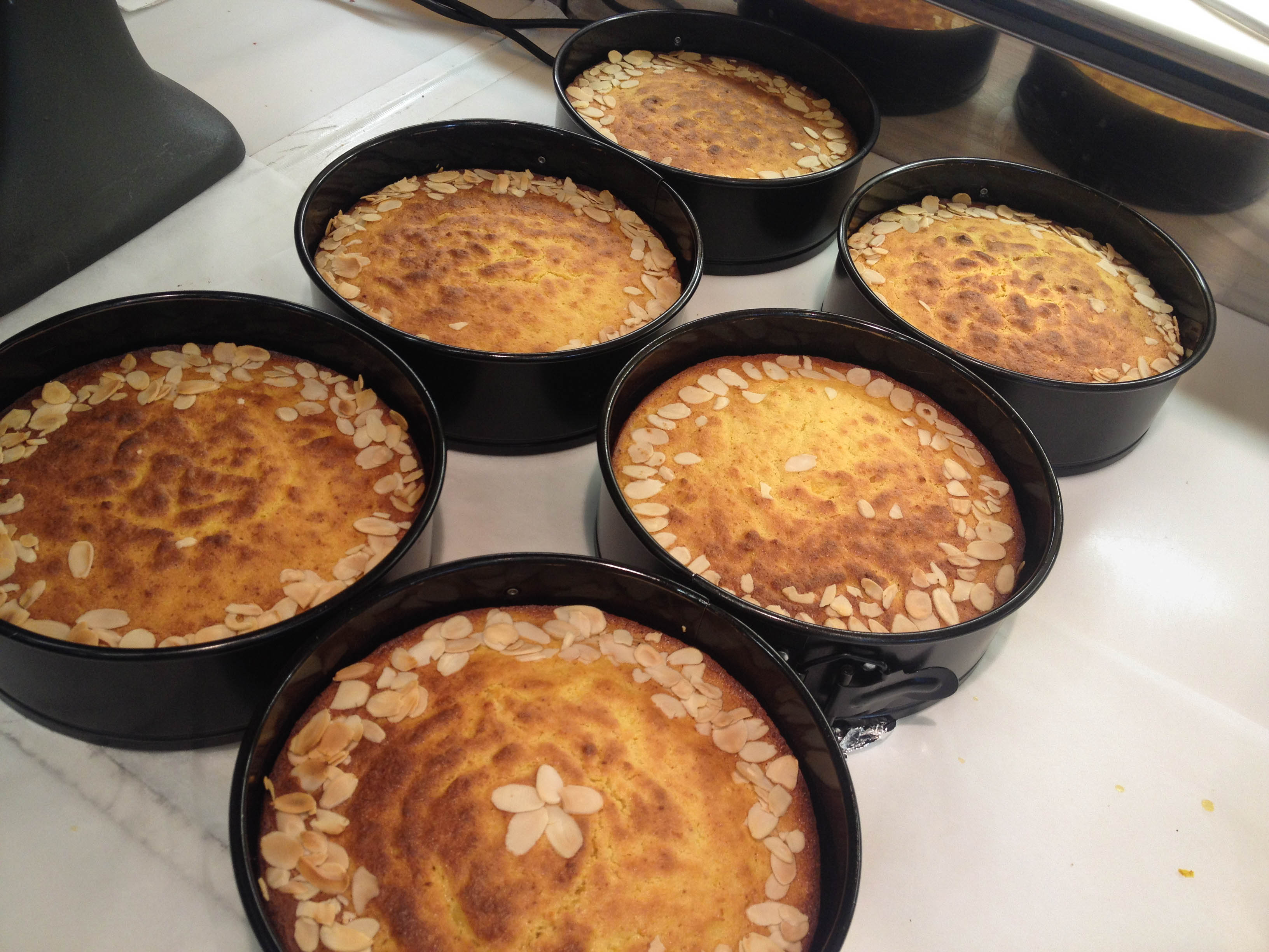 The class itself was small, with room just six of us, plus our lovely teacher Laure and her assistant Lucy. There were another keen, regular baker like myself, one person who had never made a cake before, and everything else in between – but the class catered for everyone. It was very informal and a lot of fun, with laughter fuelled by tea, cake, and the discovery that a computer fan can split a once-perfect cream cheese frosting (who knew?). We began by pairing up and starting work on mini versions of Konditor & Cook’s signature Curly Whirly Cake, by making a dense, fudgy chocolate cake. While this baked, we made the gluten- and dairy-free Almond St Clements Cake, which was incredibly quick to make (as the part that involves boiling oranges for two hours had been done for us!), and very simple: definitely one I plan to replicate at home – boiling oranges and all. We topped our batters with flaked almonds and transferred them to the oven, then sat down to tea, coffee, and – of course – some Konditor & Cook cakes to snack on. We were given small slices of Lemon Chiffon and St Clements cakes, and bitesize Curly Whirly cakes.