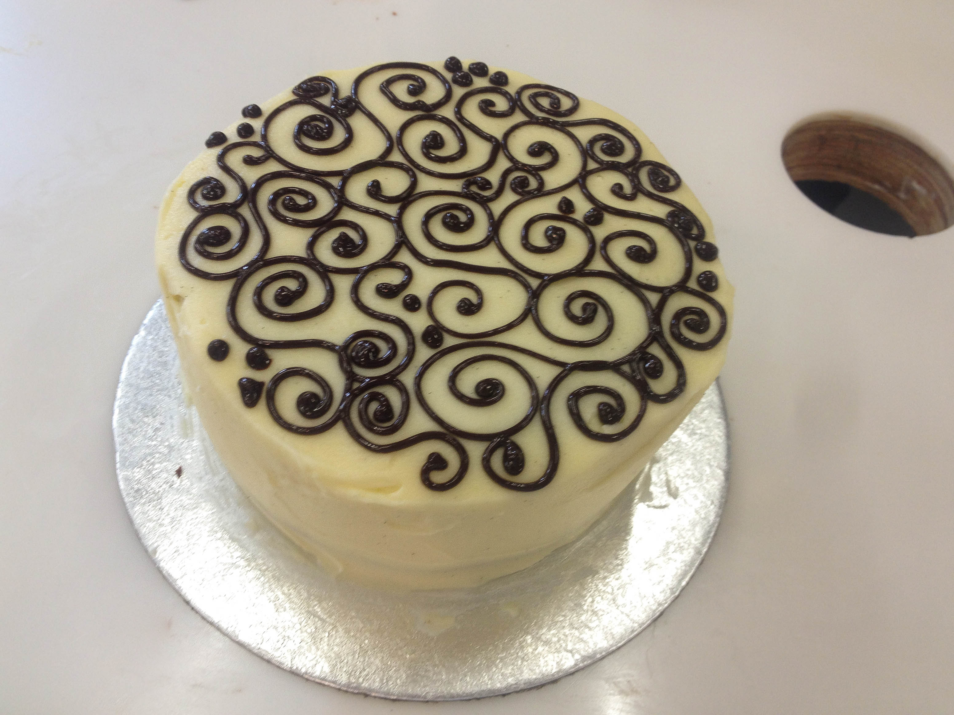 After our tea break we paired up once more to make lemon pound cakes, before being shown how to apply the crumb coat of frosting to our Curly Whirly cakes. I’d never actually used a palette knife before, and I think it’s something I’ll be purchasing next time I want to frost cakes: it’s much easier to create a smooth, even finish than it is with a knife (which is what I usually use). Our crumb-coated cakes were put in the fridge while we glazed the cooled St Clements cakes, then retrieved once more for the final layer of frosting and the chocolate decoration. We were shown how to make piping bags using greaseproof paper and origami magic, then given a chance to practice piping our ganache before taking the plunge on top of the cakes! I loved this part, and was pretty pleased with my result, which, though not perfect, I thought was recognisable as a K&C Curly Whirly cake.