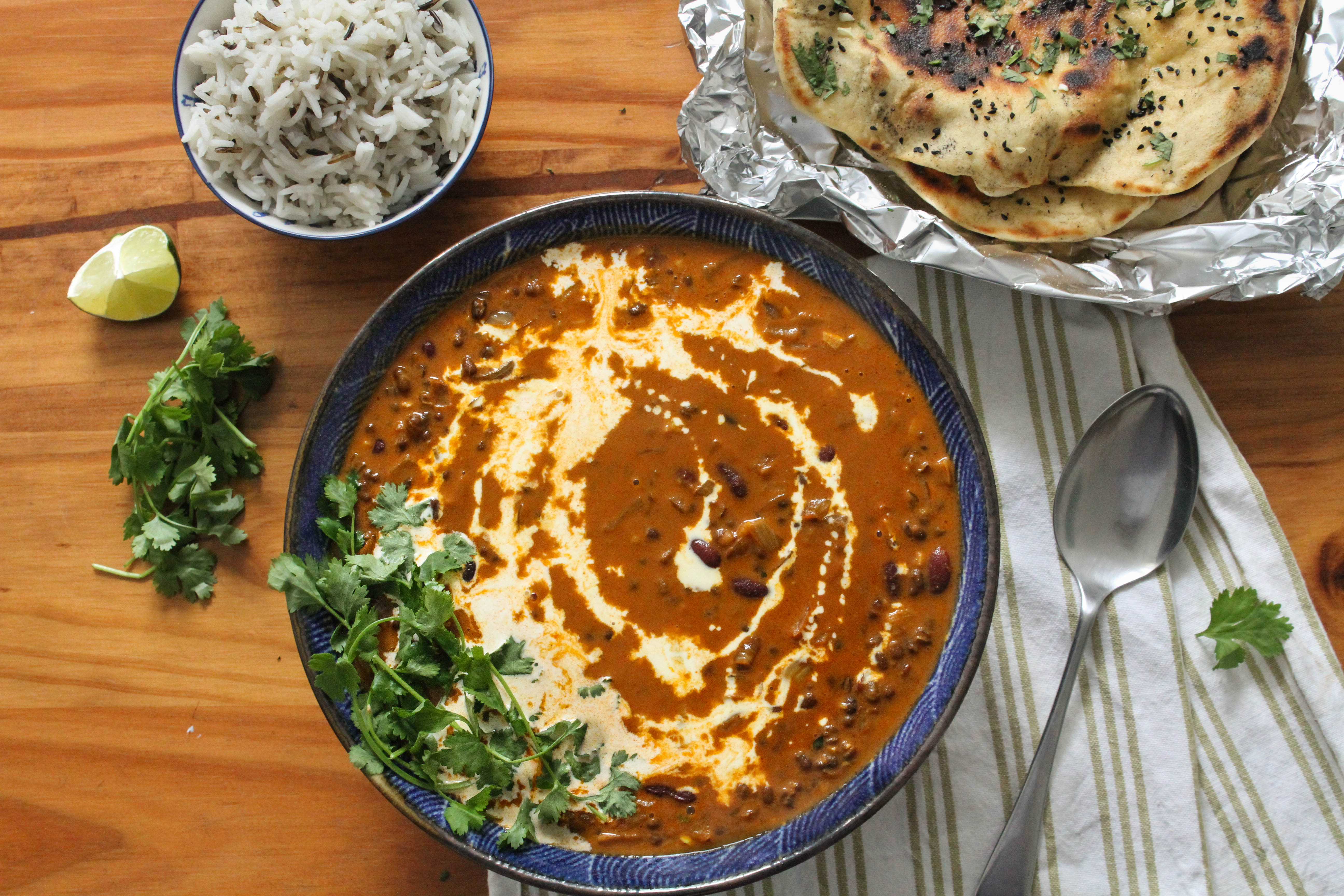 - Stir in the garlic, ginger and chilli and cook for a few more minutes before adding the garam masala, ground cumin, turmeric, ground coriander and chilli powder. Stir to coat; cook for another minute then add the tomato purée, kidney beans, bay leaf, cardamom pods, chopped tomatoes, half the cream and the cooked urid dal, along with the water. If necessary add a little more water so everything is covered, then bring to the boil. Cover and simmer for 1½ hours.