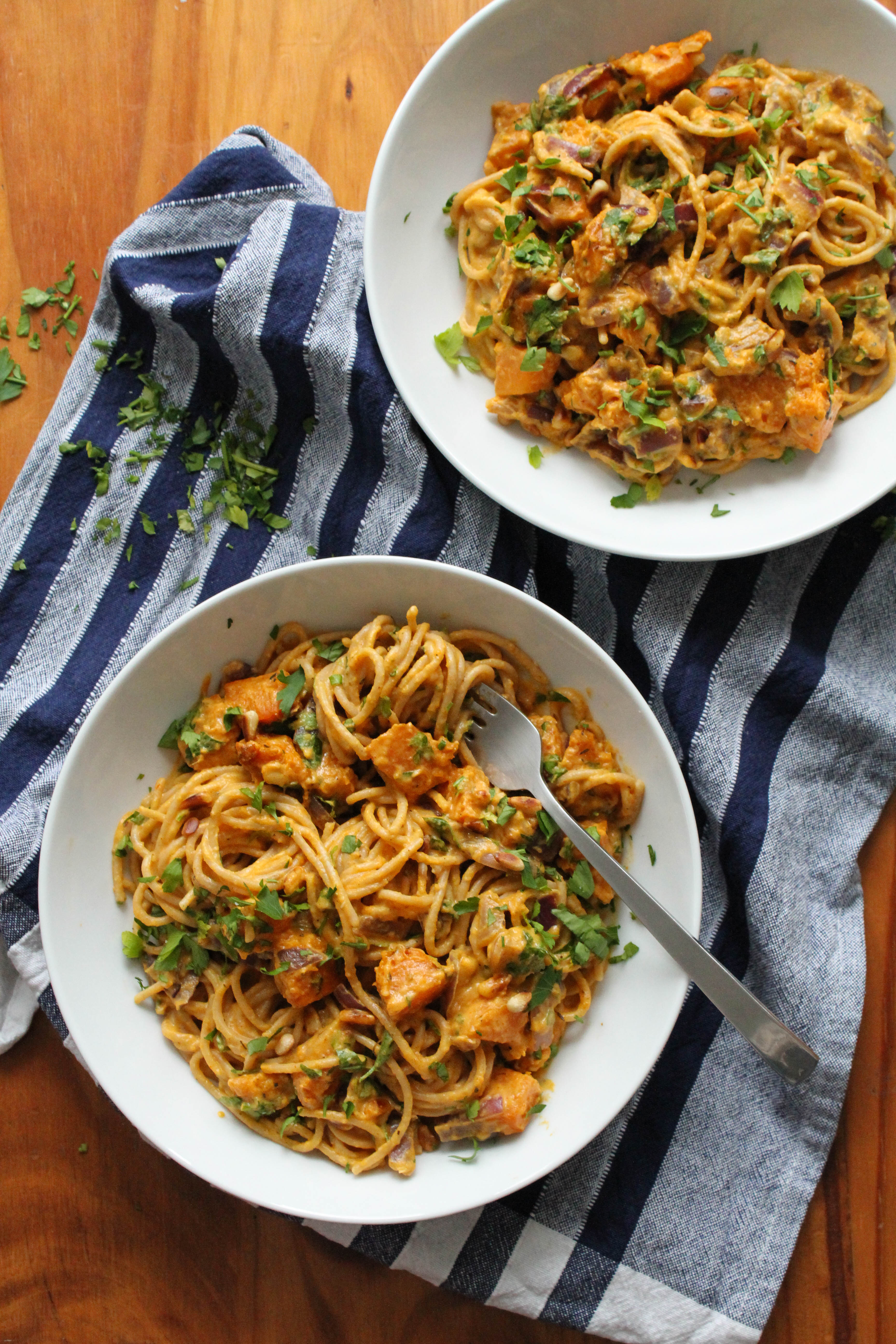 - Put half the roasted butternut squash in a food processor with the cream and vegetarian parmesan (or nutritional yeast), and blitz until smooth. Add 4-5 tbsp of the reserved pasta water to loosen the sauce (the rest can be discarded).