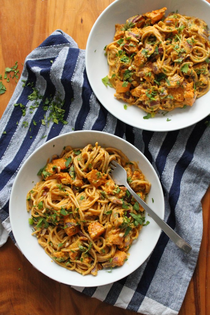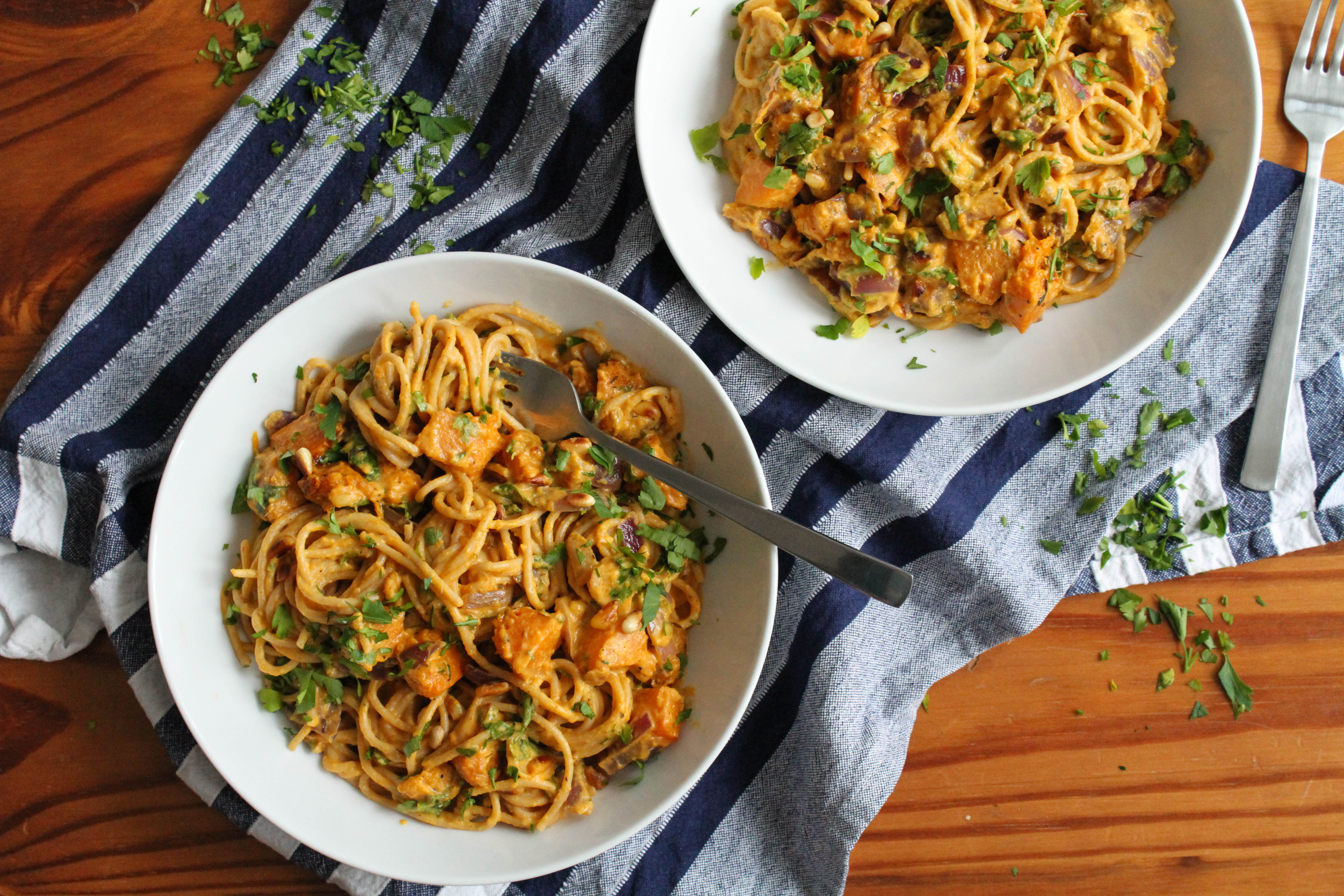 Who doesn’t love tucking into a huge bowl of pasta on a chilly evening? The butternut squash pasta sauce is so beautifully creamy, but the soft crunch of the pine nuts and red onion and the citrus, grassiness of the parsley cut through it beautifully. It’s easily made vegan, too.