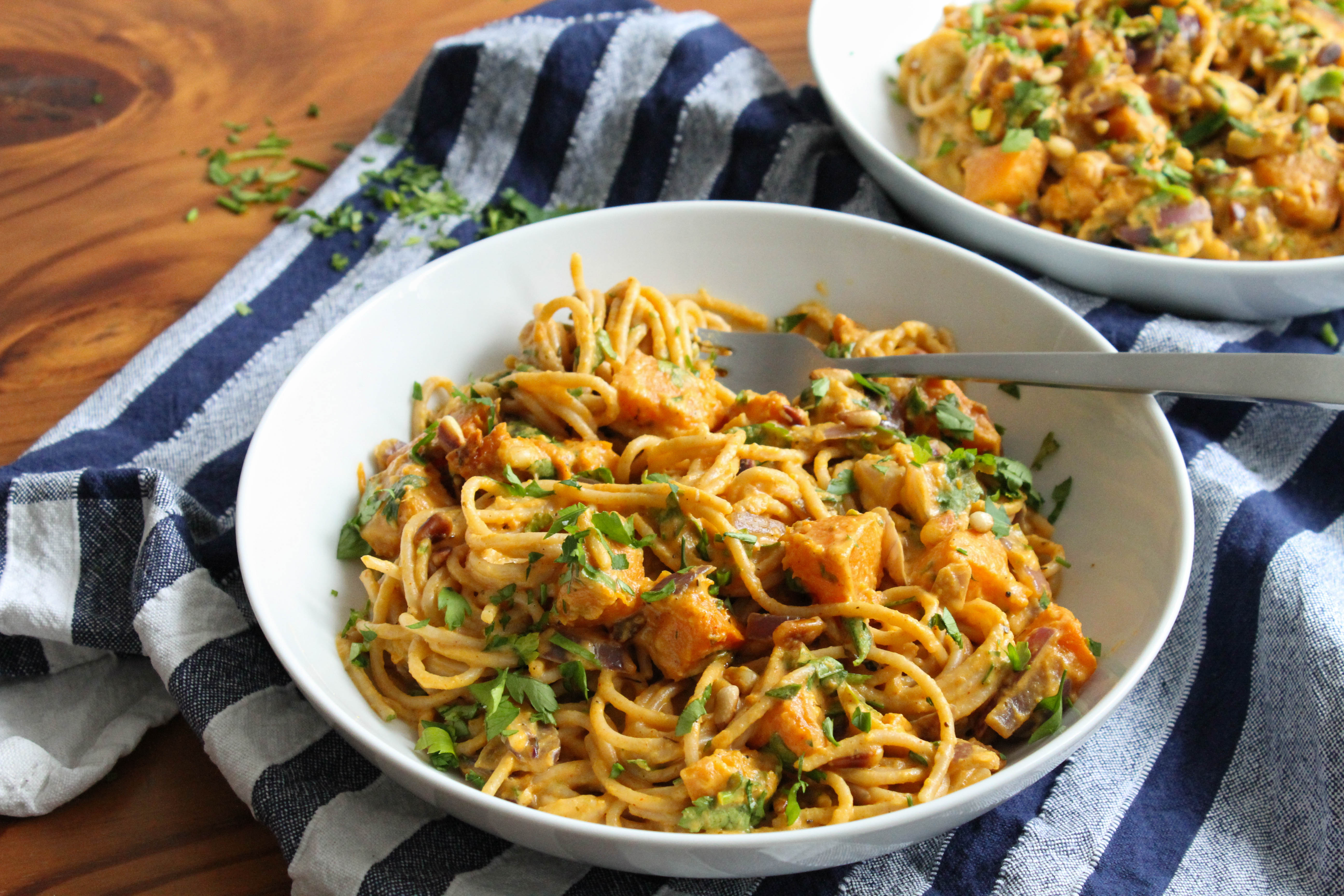- Stir the butternut sauce into the spaghetti, along with the rest of the roasted squash, the pine nuts, red onion and chopped parsley.