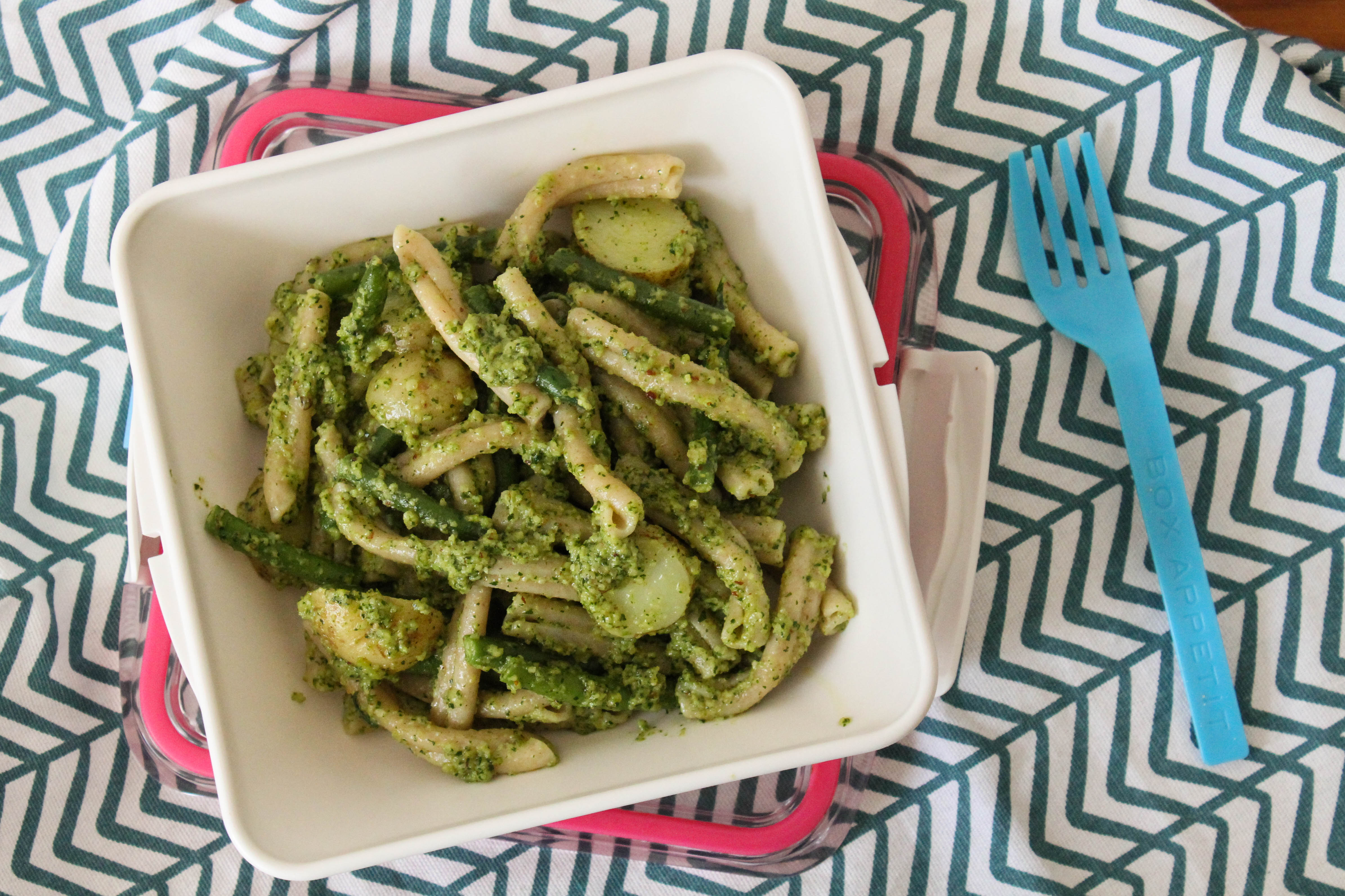 2. Drain, then stir in the pesto. Divide between two lunch boxes and store in the fridge.