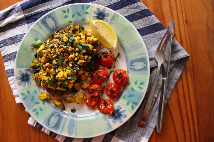 4. Toast and butter your bread, divide between two plates and top with the tofu scramble. Scatter over the seeds and remaining parsley, and serve with the grilled tomatoes and lemon wedges.
