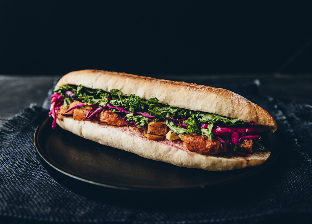 “Parsnip fritter with spiced butternut squash, kale and cranberry sauce in a hand-stretched ciabatta”