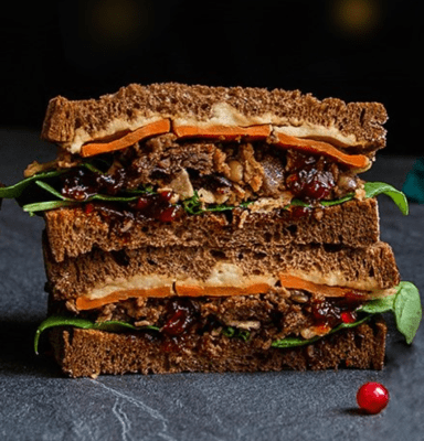“Crumbled falafel with parsnip stuffing, carrot, cranberry sauce, mayo and dresh spinach on malted bread”