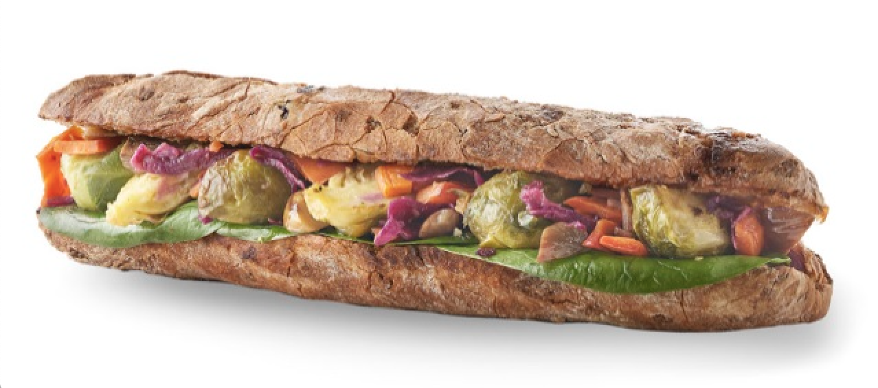 “Parsnip hummus, grilled carrot, nut roast, crispy onion, chilli jam and spinach on 50% wholegrain bloomer”