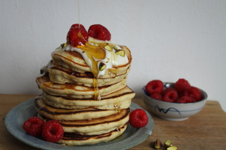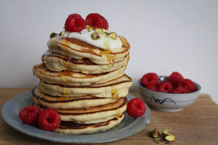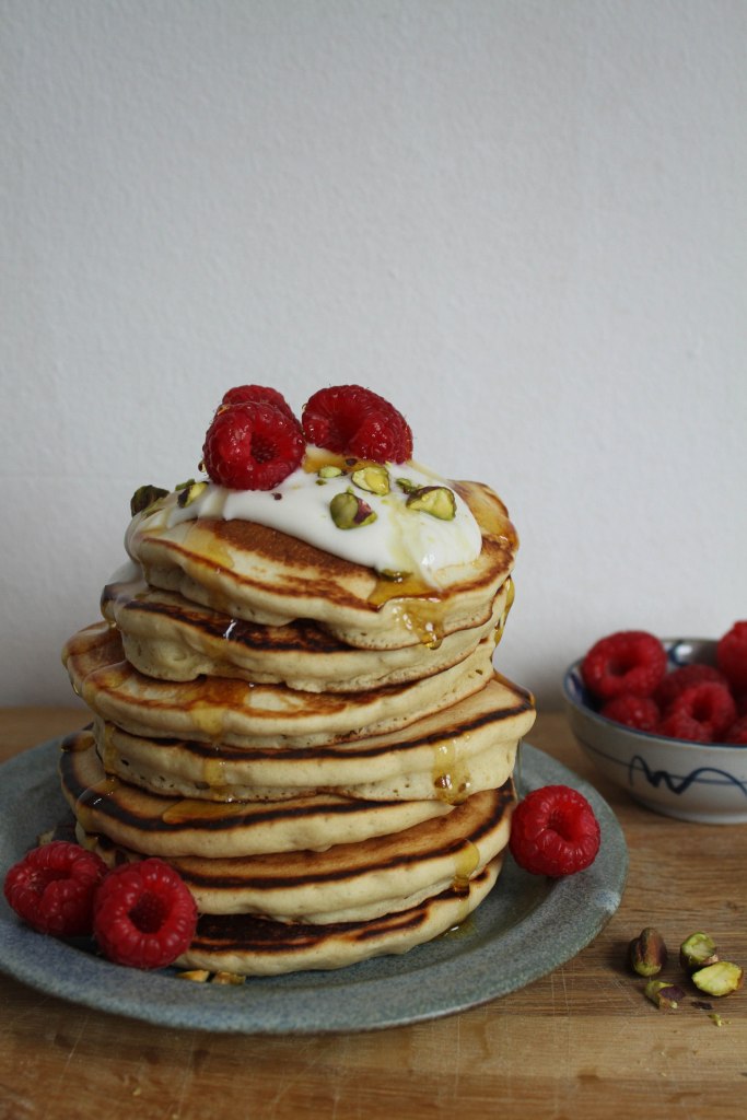 One of my favourite things about pancakes is playing with the toppings: this time I served mine with oat yogurt, fresh raspberries, chopped pistachios and golden syrup. If I’m feeling particularly energetic I’ll make a sauce, or for lazier days a sticky maple syrup stack is unbeatable.